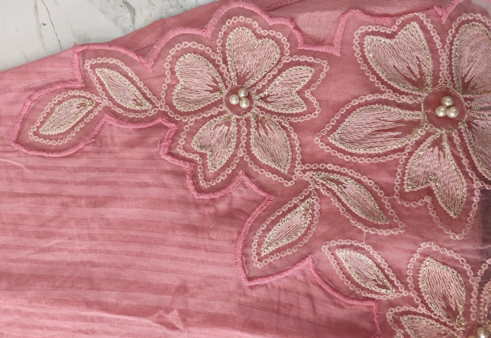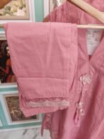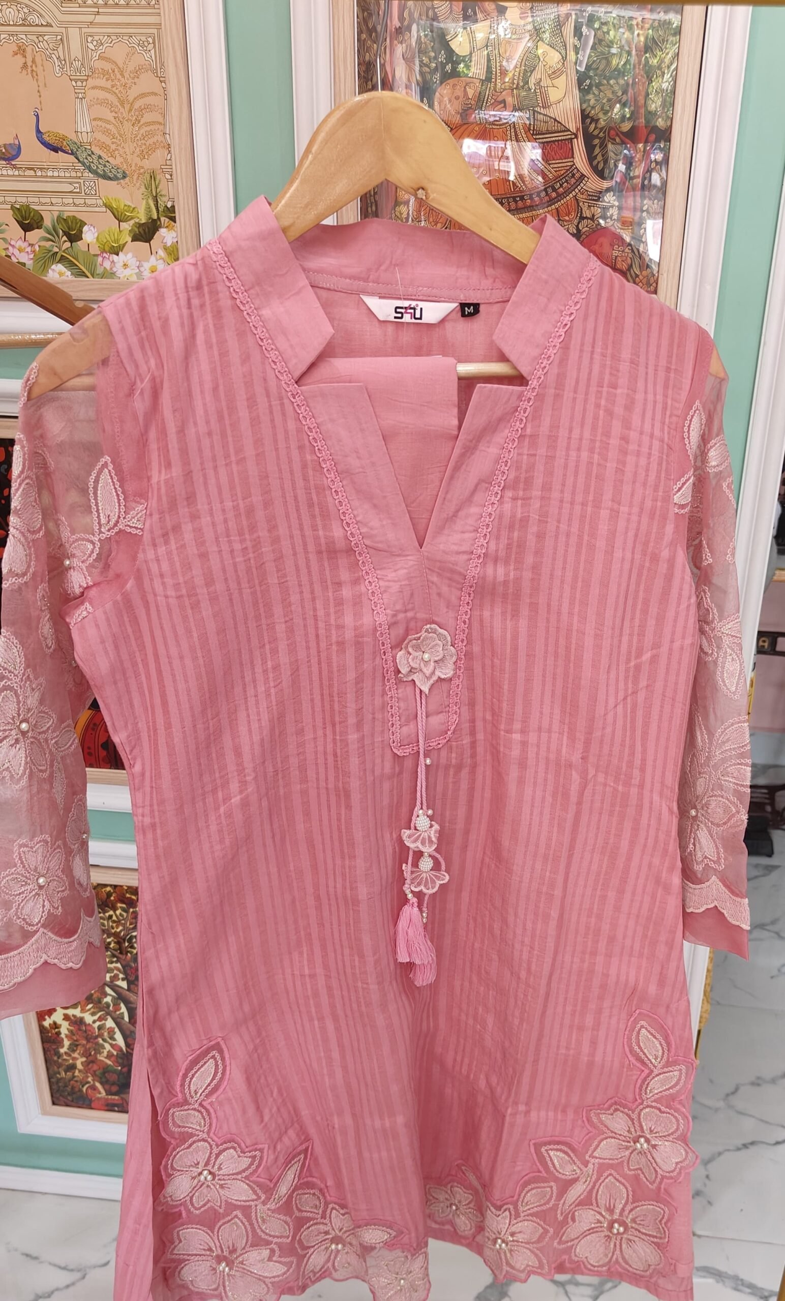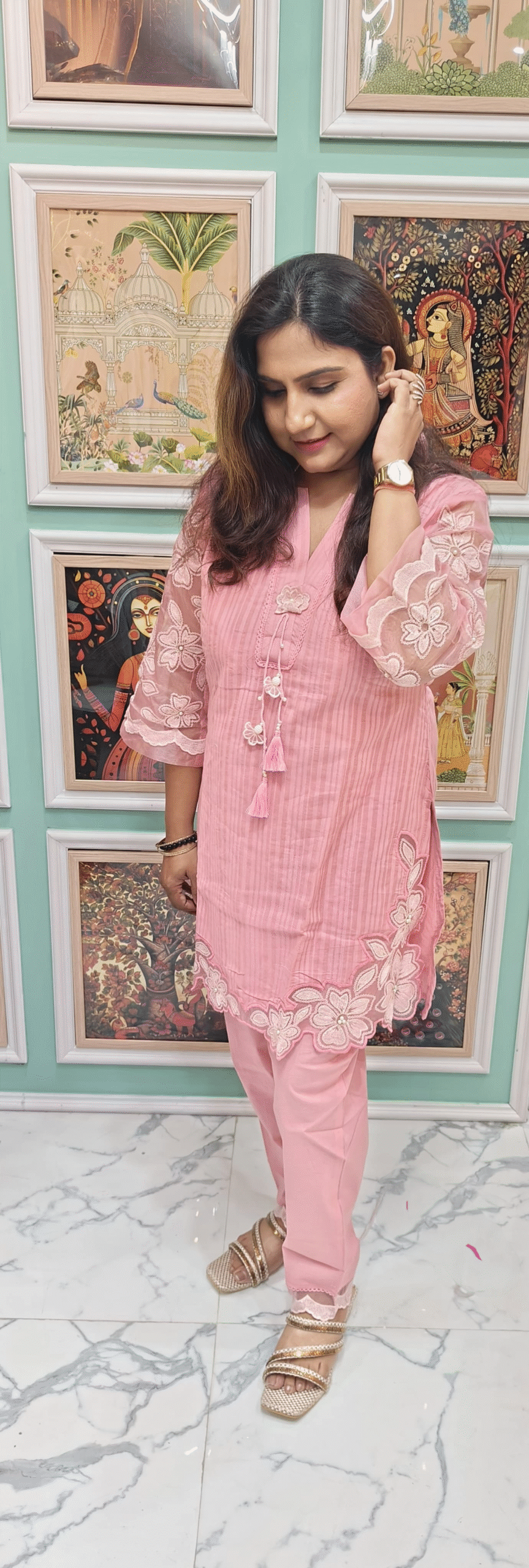A stylish pink co-ord set with a subtle vertical stripe texture. It features a V-shaped neckline with delicate lace piping along the edges and a small floral lace motif with tassels hanging from the placket, adding a charming detail. The sleeves are three-quarter length and made of sheer fabric adorned with intricate white floral embroidery.