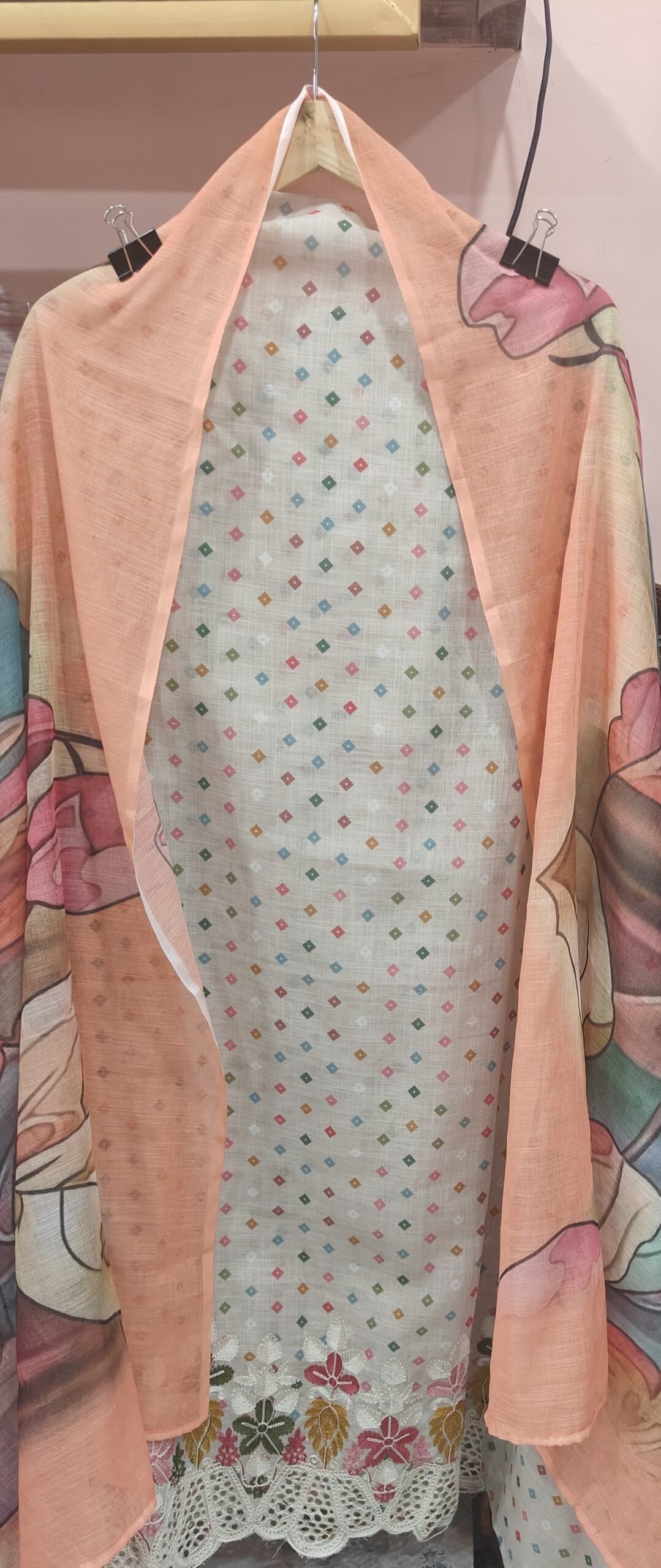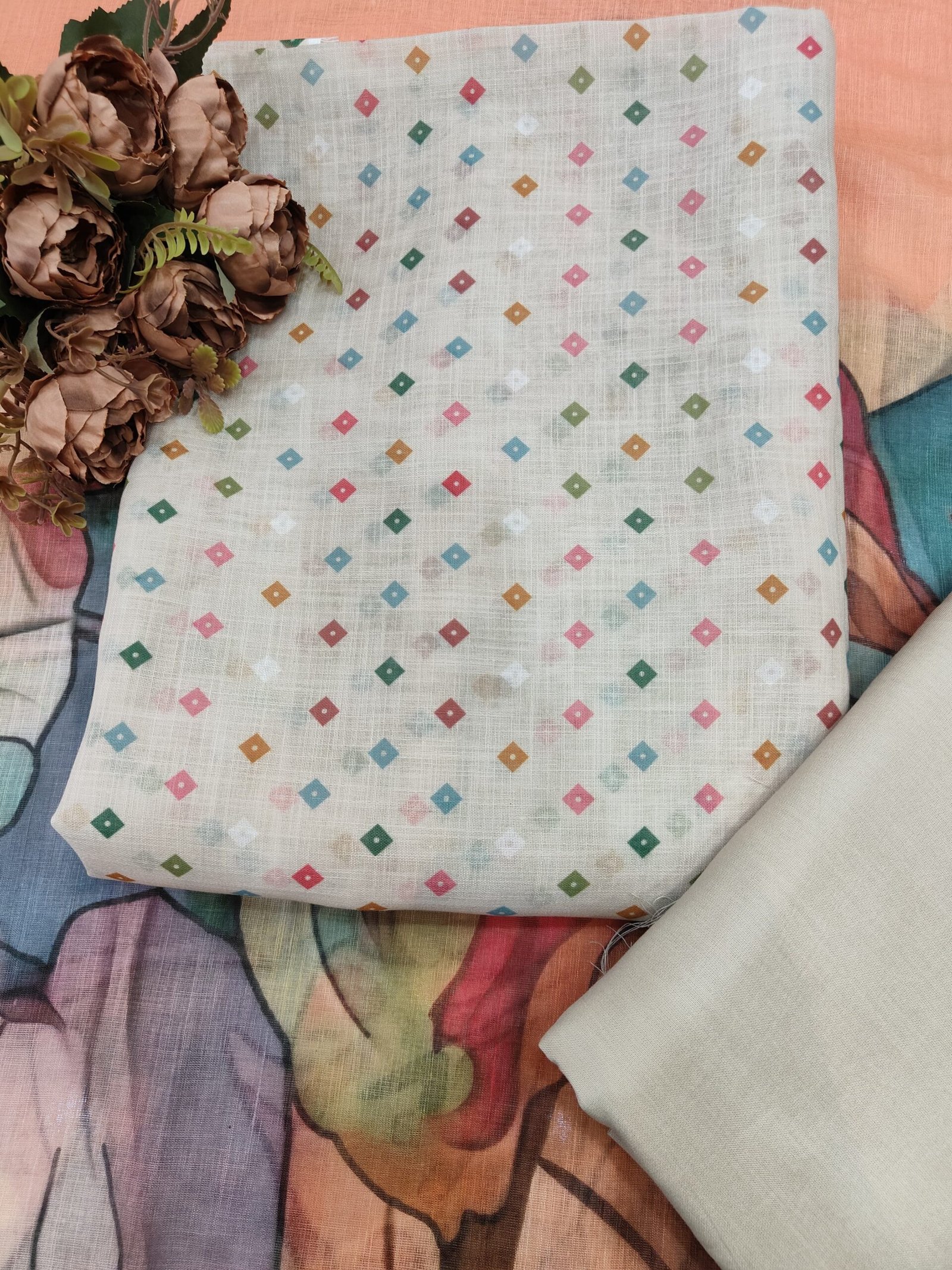 A linen cotton unstitched suit that features multicolor diamond motif pattern arranged in a grid layout across the entire fabric, creating a playful yet elegant look. The bottom edge is adorned with rich floral embroidery. The floral embroidery is highlighted with intricate threadwork and small cutwork lace that adds feminine and graceful touch.