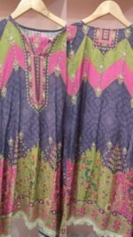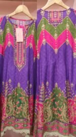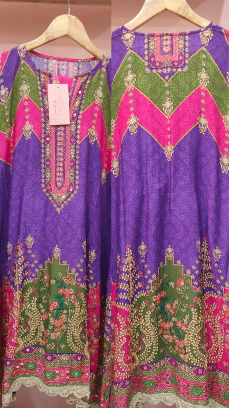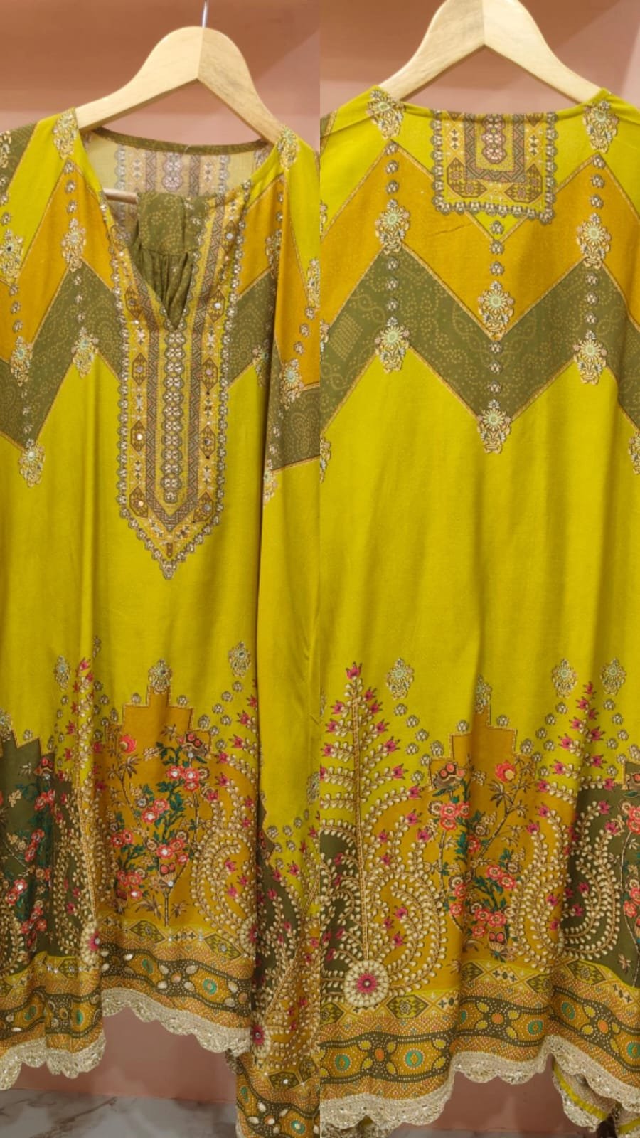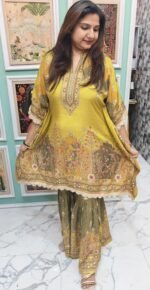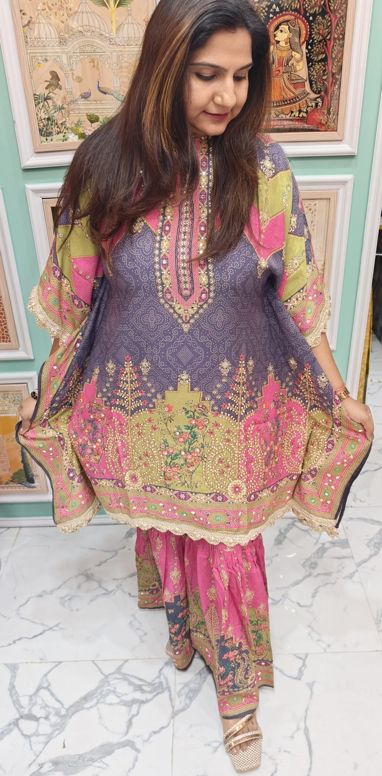 A vibrant kaftan in short style with sharara perfect for any formal occasion. It’s in digital print highlighted with stone and mirror work giving it a richer look. The kaftan is adorned with a gotta lace from borders and sleeves.