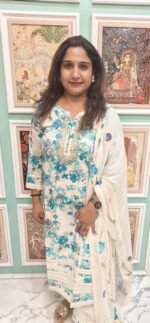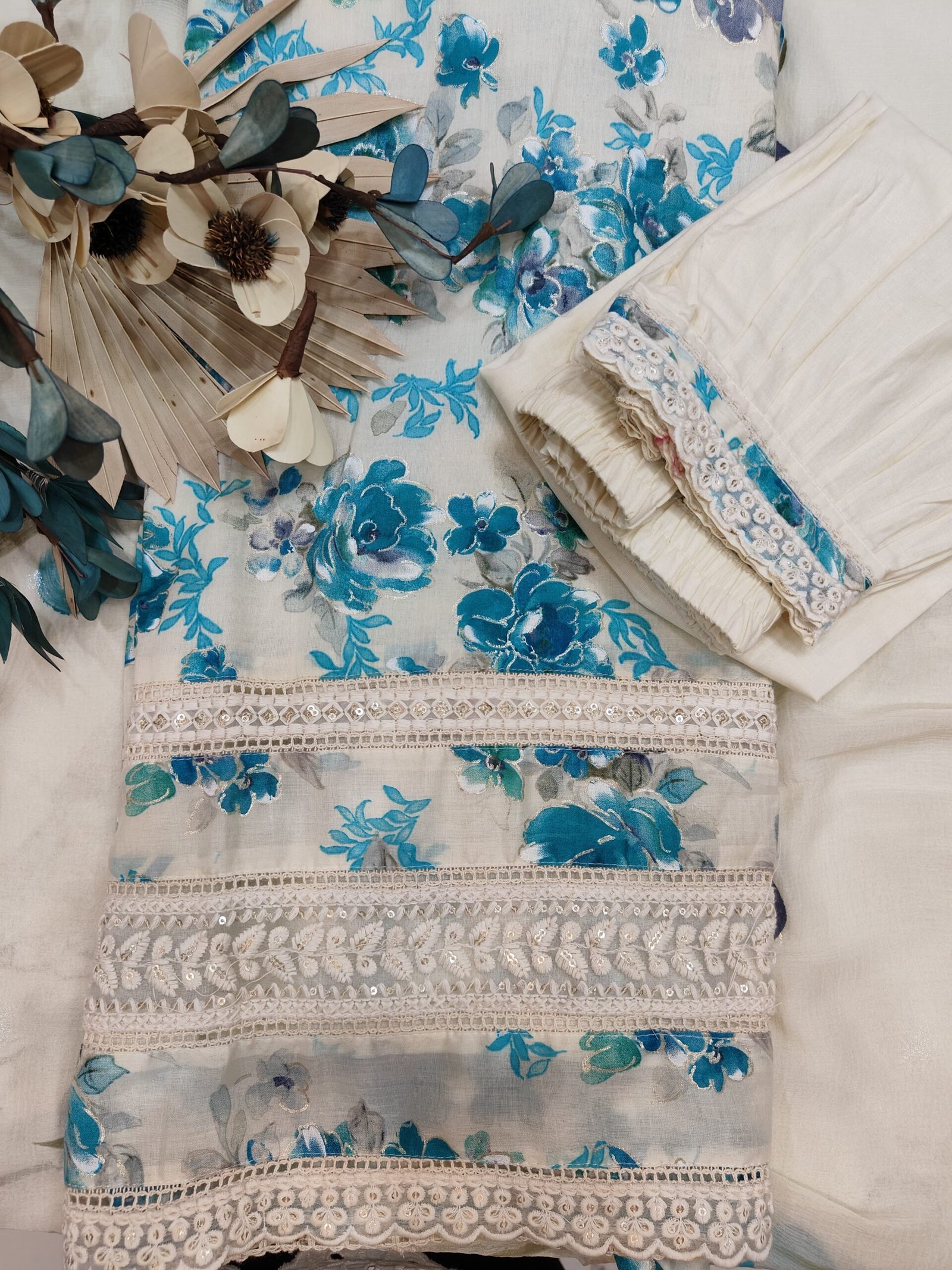 Light weight dupatta with hand paint floral prints in matching hues of blue and green on a soft beige base, creating a coordinated look with the kurta. Soft lace borders the dupatta that adds a delicate feminine touch.