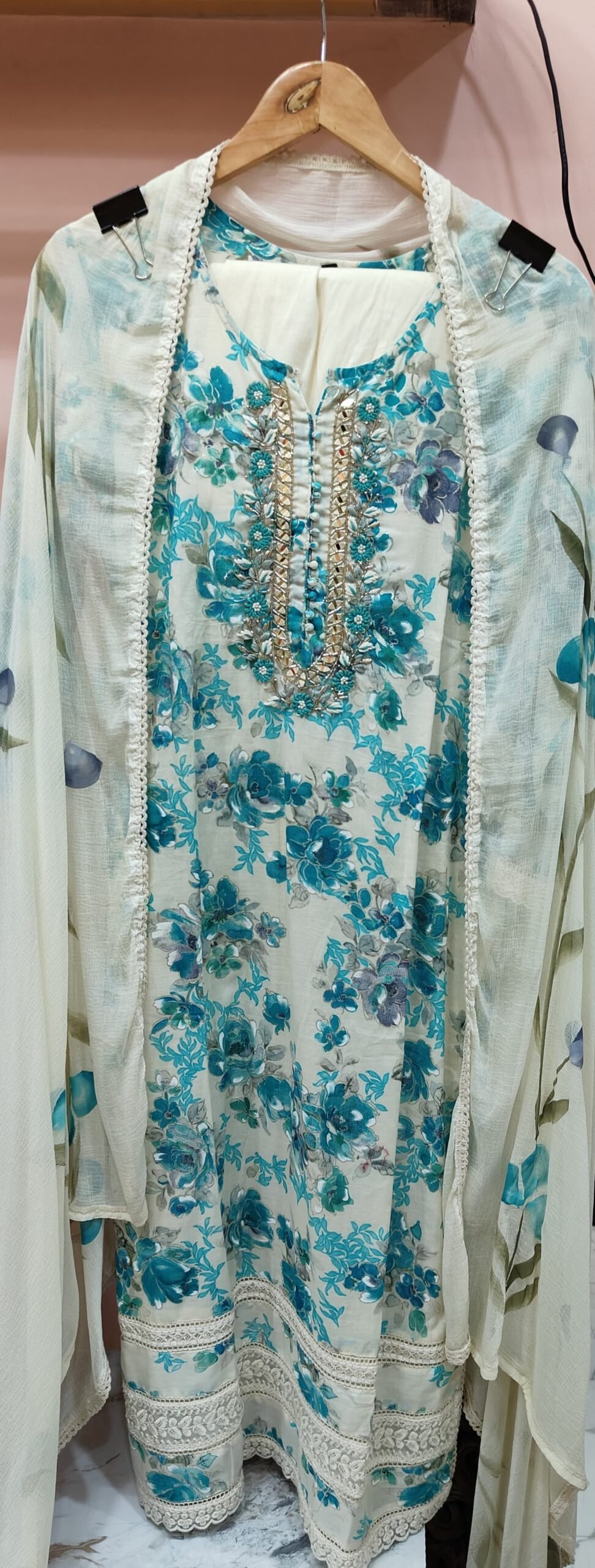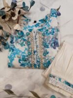 A cotton stitched suit adorned with all-over turquoise blue floral prints, with hints of teal and green foliage. It has rounded split neckline with heavy embellishment. The neckline is highlighted with intricate mirror work, bead, and thread embroidery, forming a vertical panel that adds richness to the design.