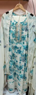 This outfit exudes a fresh, graceful, and summery vibe, ideal for day functions, festive gatherings, or semi-formal events. The blend of printed florals with subtle shimmer on the neckline creates a balanced, classy aesthetic.