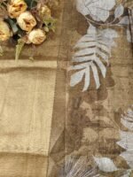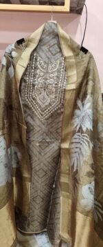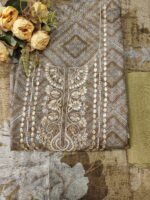 The suit is a beautiful fusion of modern prints with traditional embroidery, perfect for festive occasions or elegant evening wear. The earthy color palette and shimmery undertone lend it a classy, understated grace