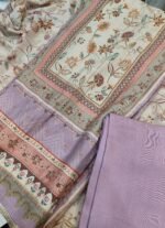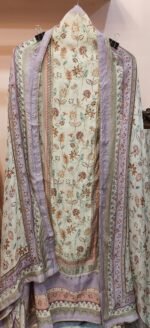A very light and comfortable yet elegantly designed modal cotton silk suit in a digital floral print at the center. The digital print is highlighted with golden thread giving it a shine. Surrounding the central panel are borders with symmetrical pattern in peach, gold and lavender. The fabric is as soft as a feather and hues of lavender and beige are soothing to eyes. Sleeves also has a digital print.