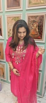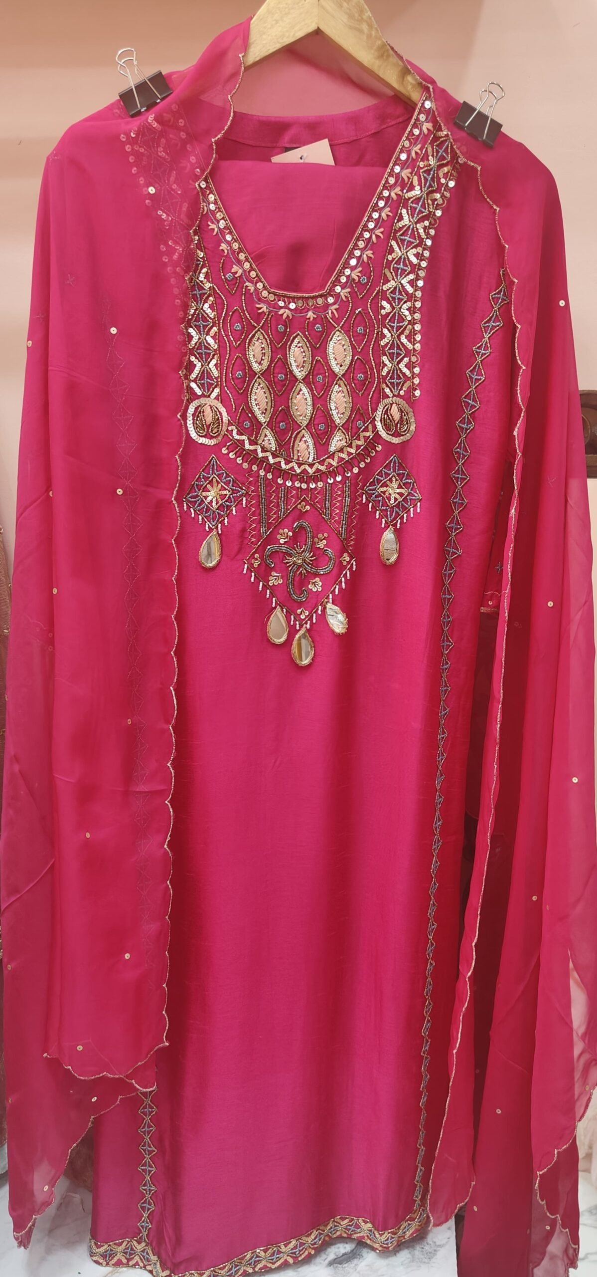 Its a stitched suit in a bright magenta pink with a beautifully detailed yoke design. The neckline is a rounded V-shape, heavily embellished with intricate embroidery in golden, maroon, and multi-colored threads. The yoke features mirror work, teardrop-shaped motifs, and geometric patterns, giving it a festive and regal appearance. The embroidery extends below the yoke into an ornate pendant-like design with hanging mirror embellishments, adding depth and visual interest.