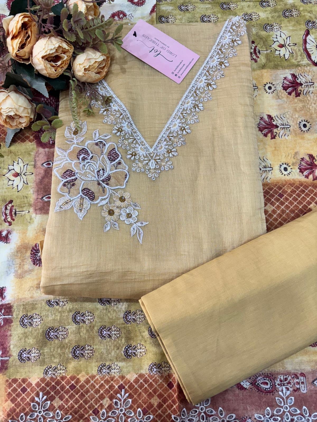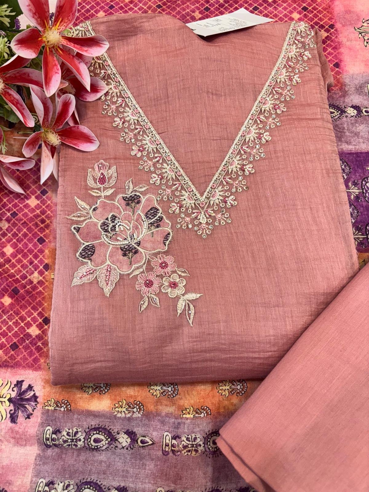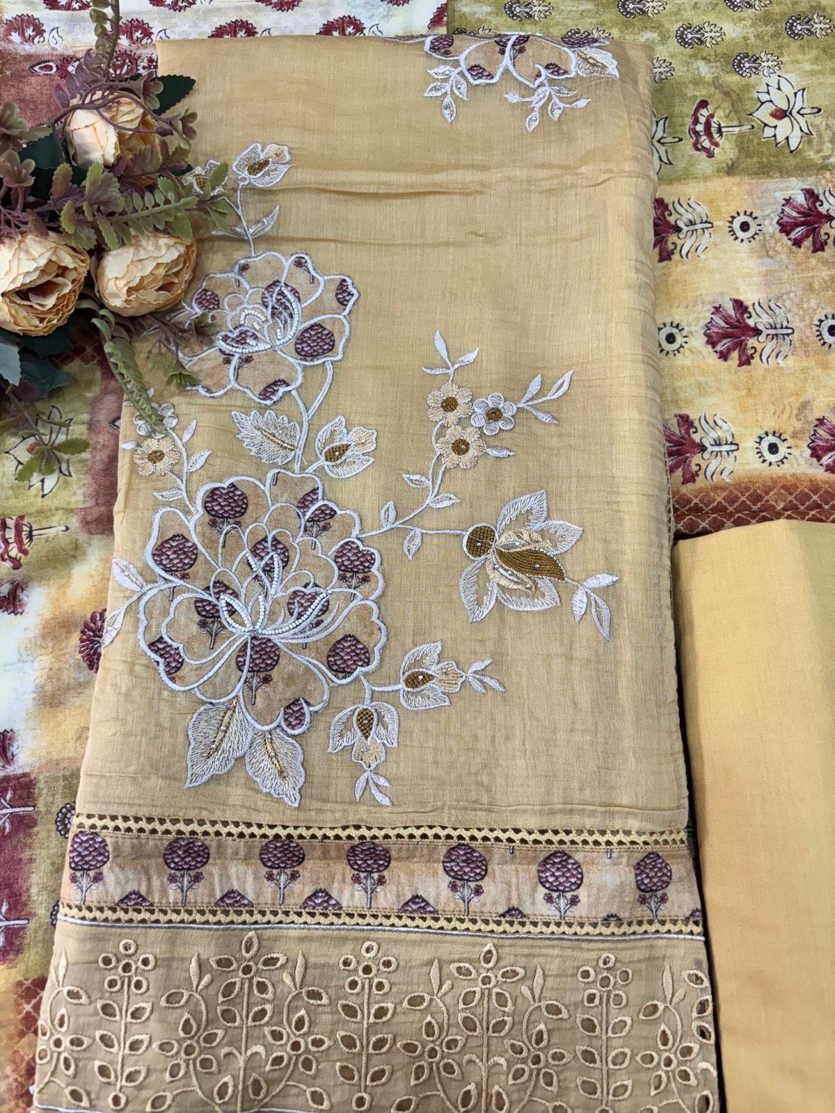 A mul chanderi unstitched party wear suit with thread and bead work.