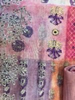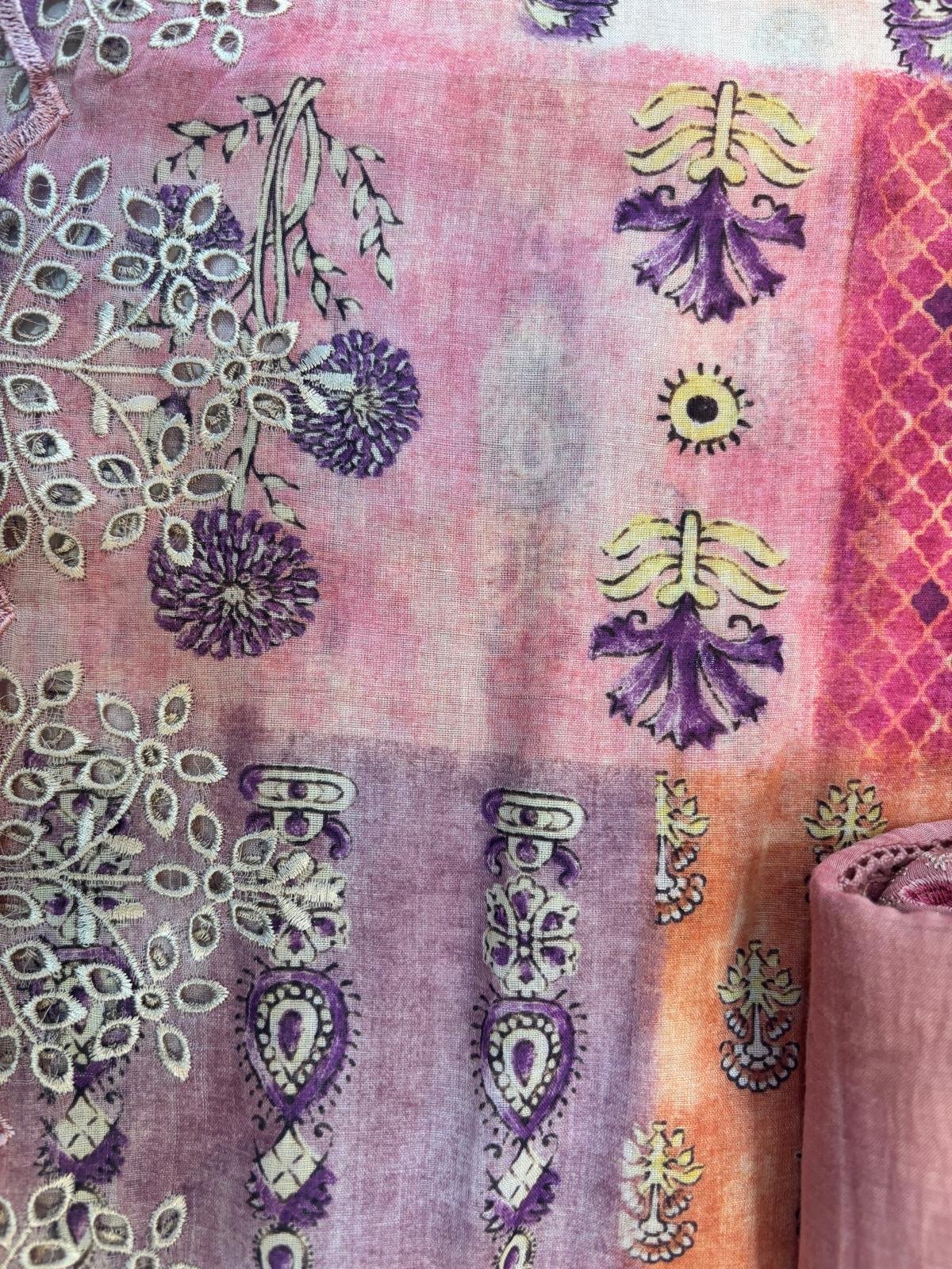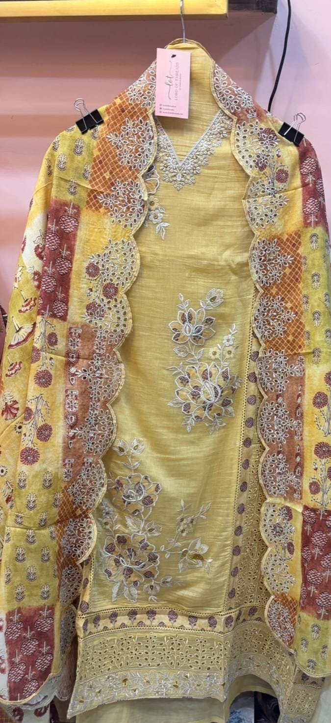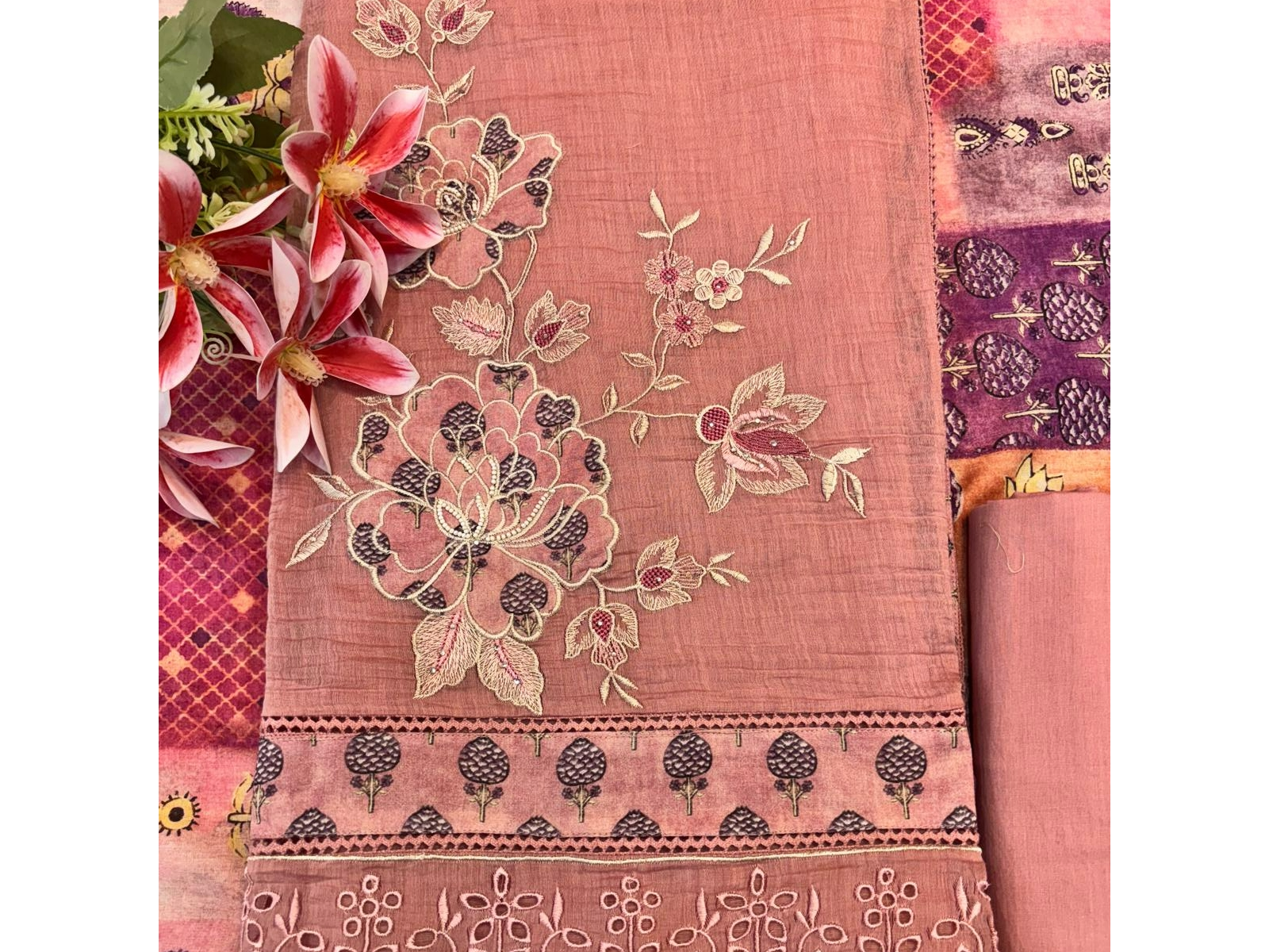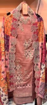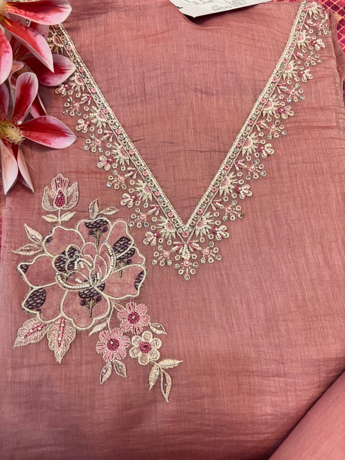 A mul chanderi unstitched party wear suit with thread and bead work.