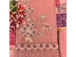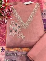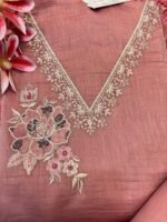 A beautiful unstitched suit in mul chanderi with V shape neckline that is adorned with bead and thread embroidery.