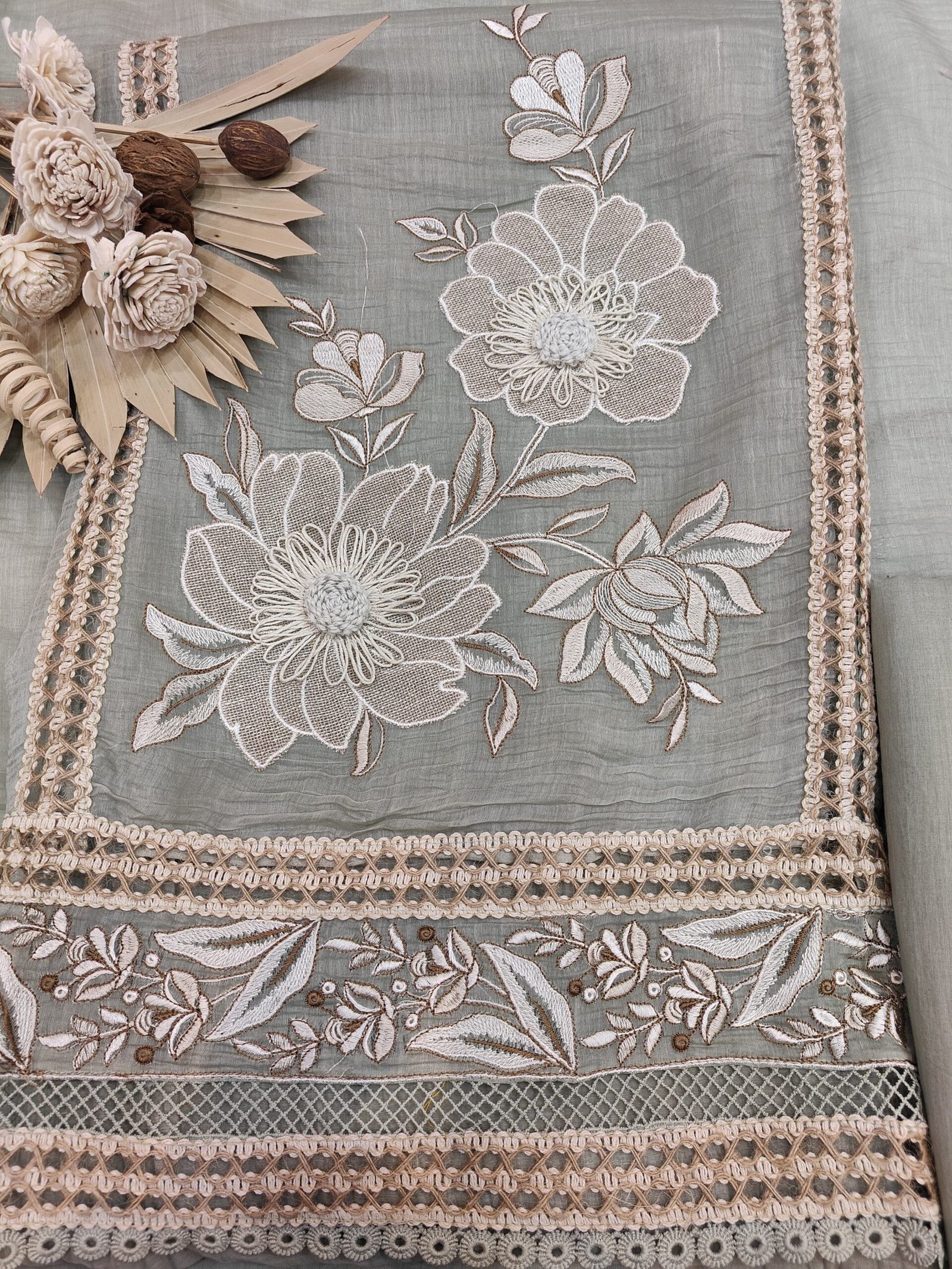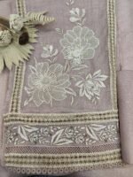 The front panel of the suit showcases graceful floral embroidery in off-white and beige tones, which stands out against the soft color base. The floral motifs are thoughtfully placed both near the neckline and towards the hem, creating a balanced design. The border is beautifully adorned with creative laces.