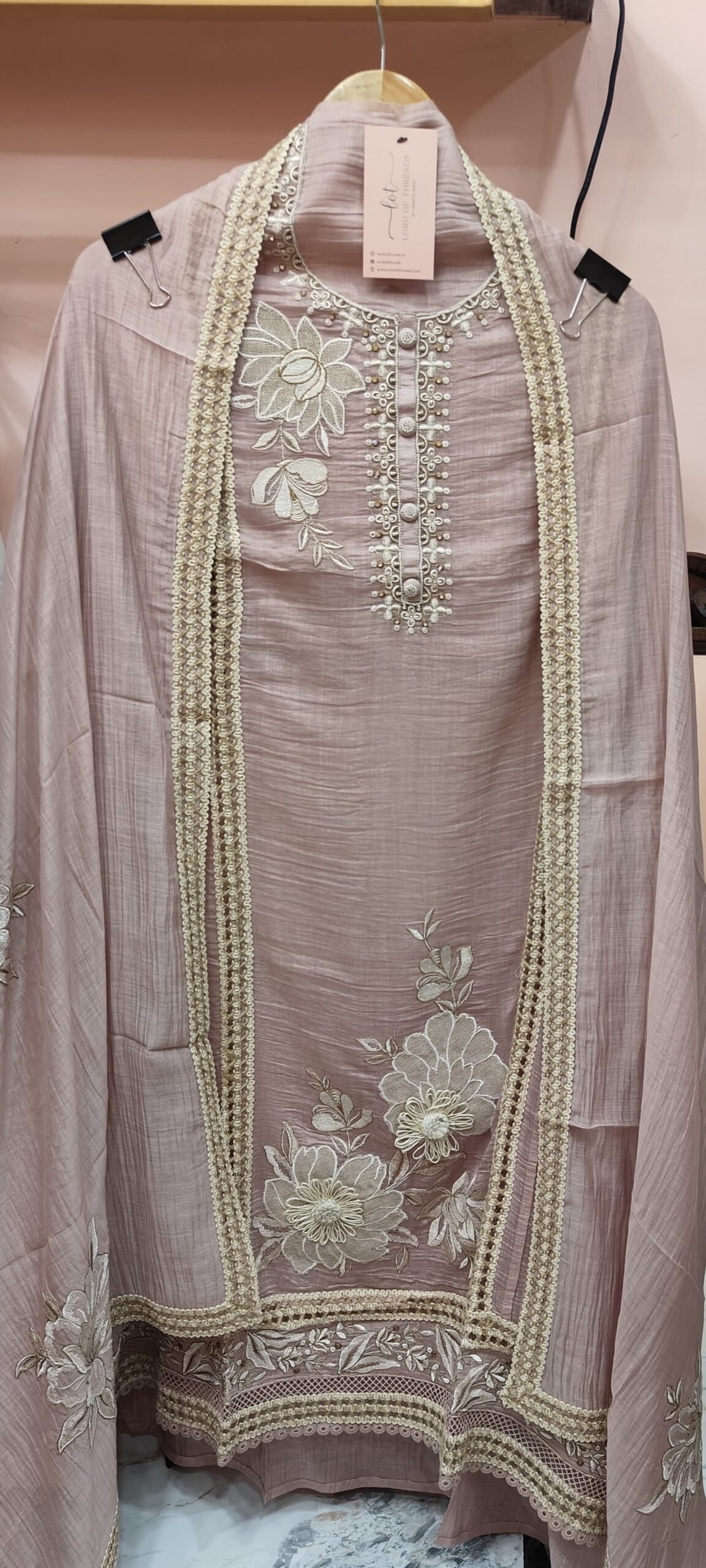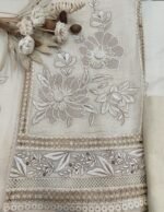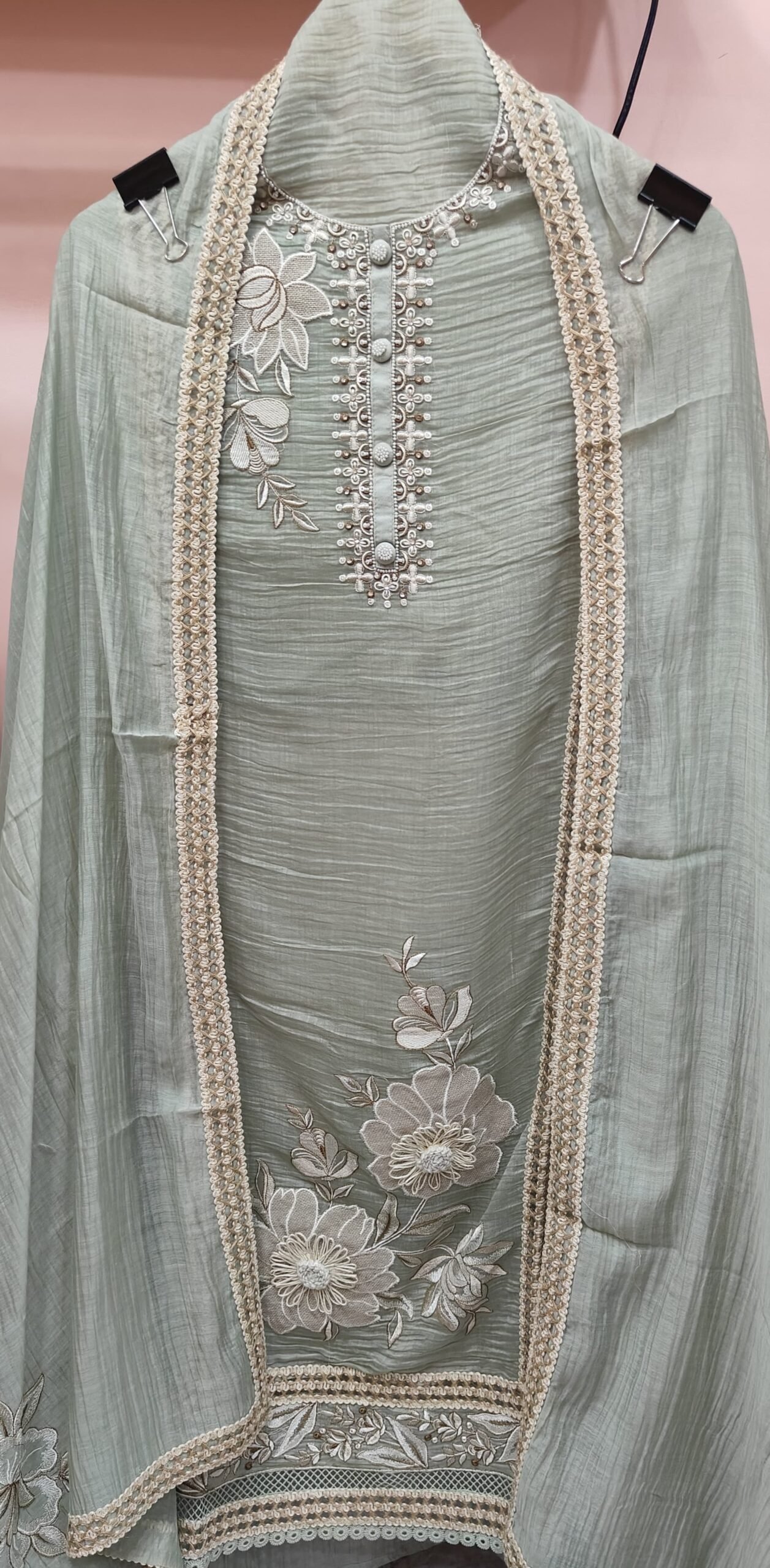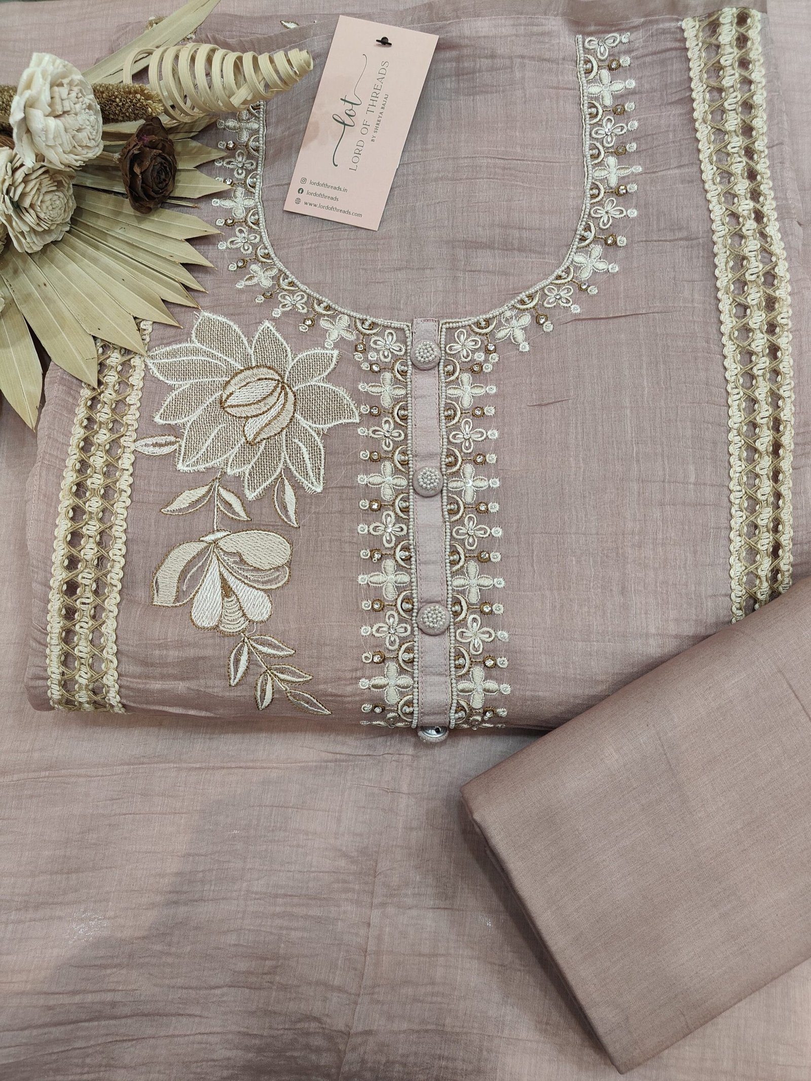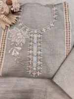 It’s an elegant ethnic suit featuring intricate embroidery and delicate detailing. The neckline is beautifully adorned with pearl and thread embroidery, highlighted by fabric-covered buttons along the placket, adding a touch of sophistication.