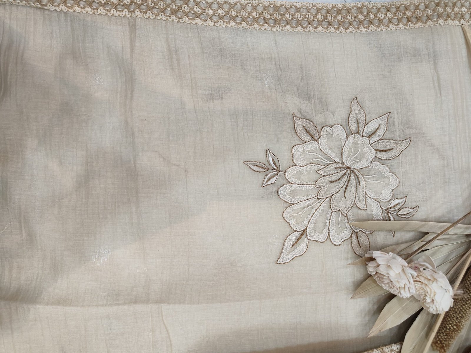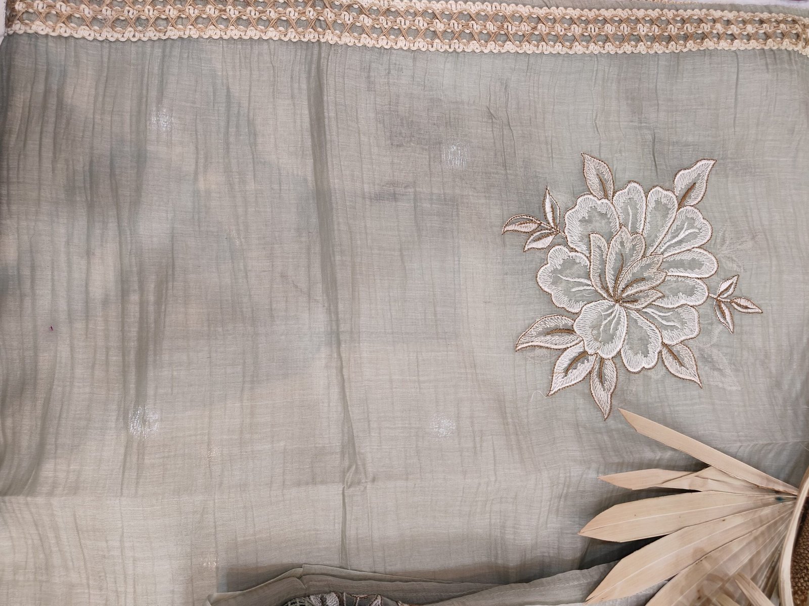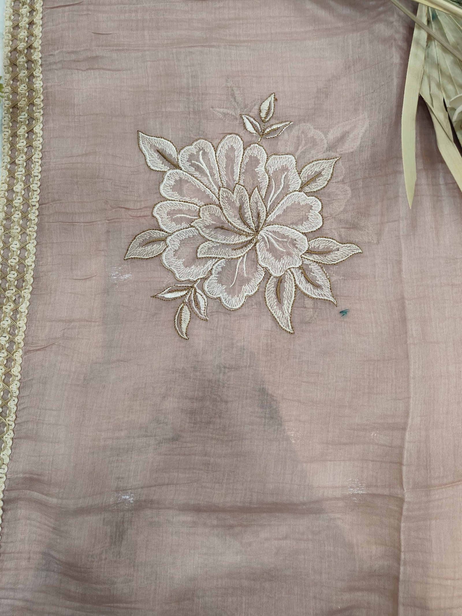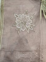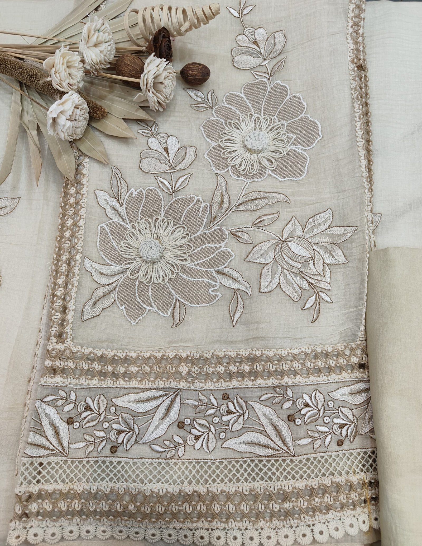 A mul chanderi unstitched suit with thread and jute work.