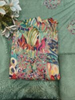 A cotton unstitched suit featuring a vibrant and artistic combination of colors and patterns. The outfit showcases a lively, multicolored floral and leafy print in shades of green, pink, orange, yellow, and blue, creating a rich and festive visual appeal. The front panel is heavily embroidered with intricate floral designs accented with delicate threadwork and sequins, adding texture and elegance.
