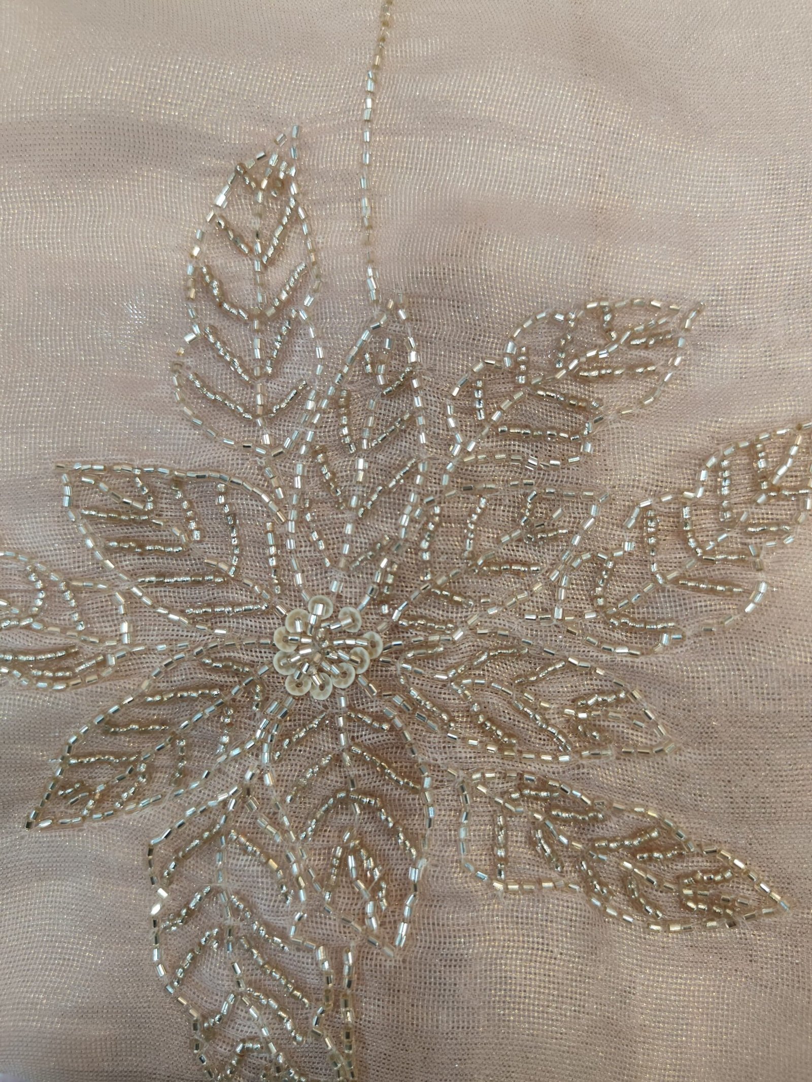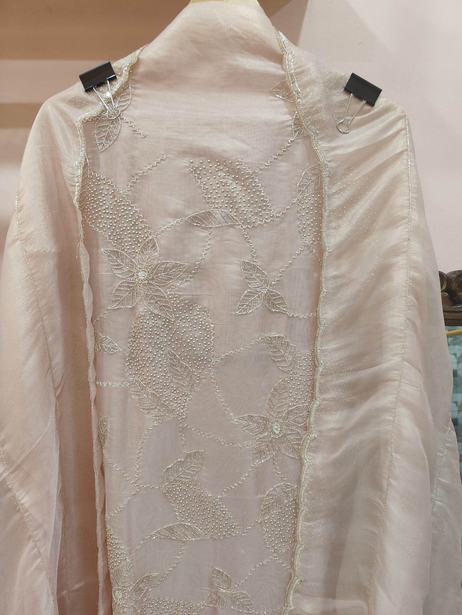 An unstitched suit in pastel color that features delicate silver embroidery with bead and sequin embellishments. The embroidery forms a repetitive pattern of flowers with leaves all over.