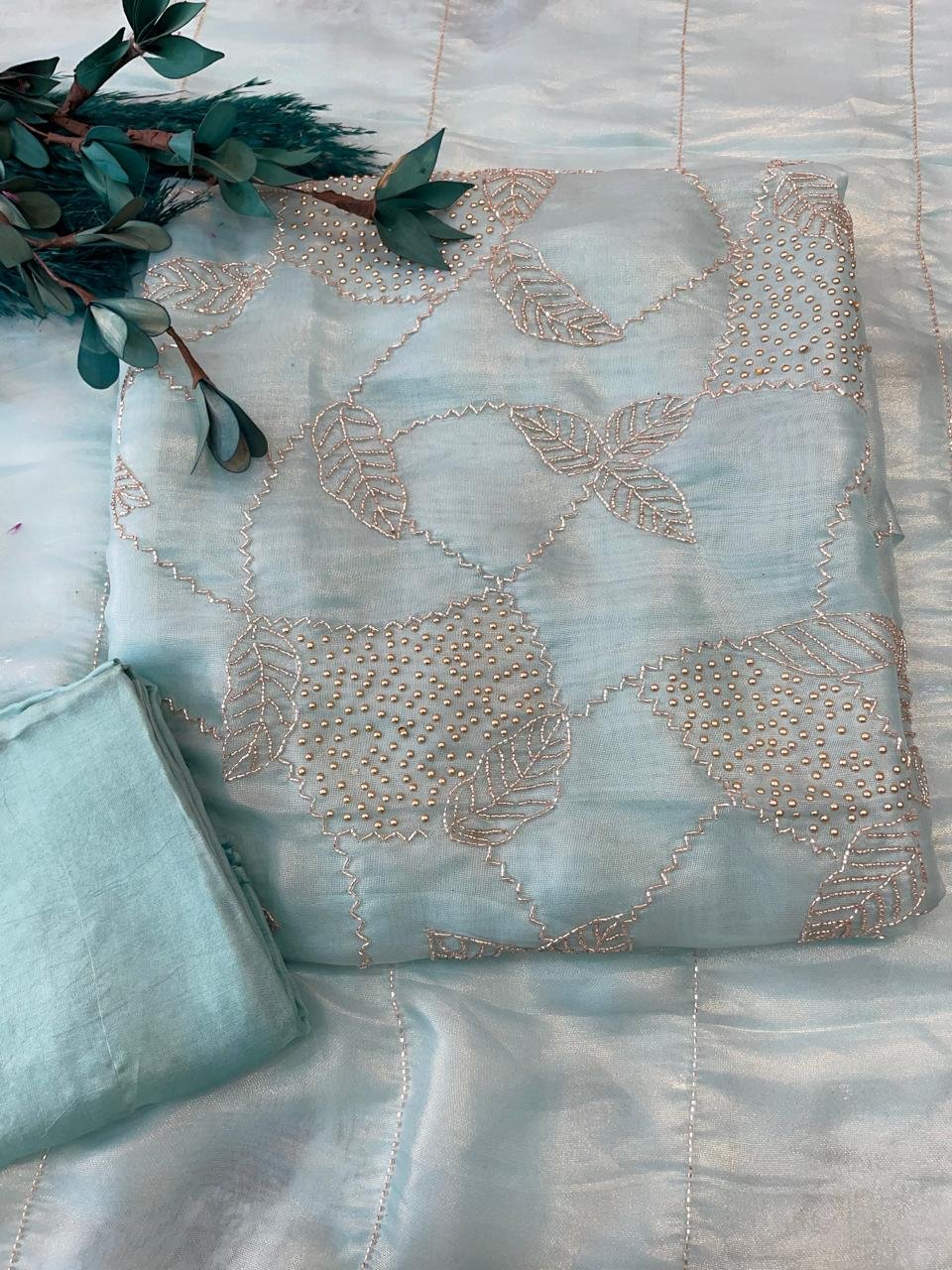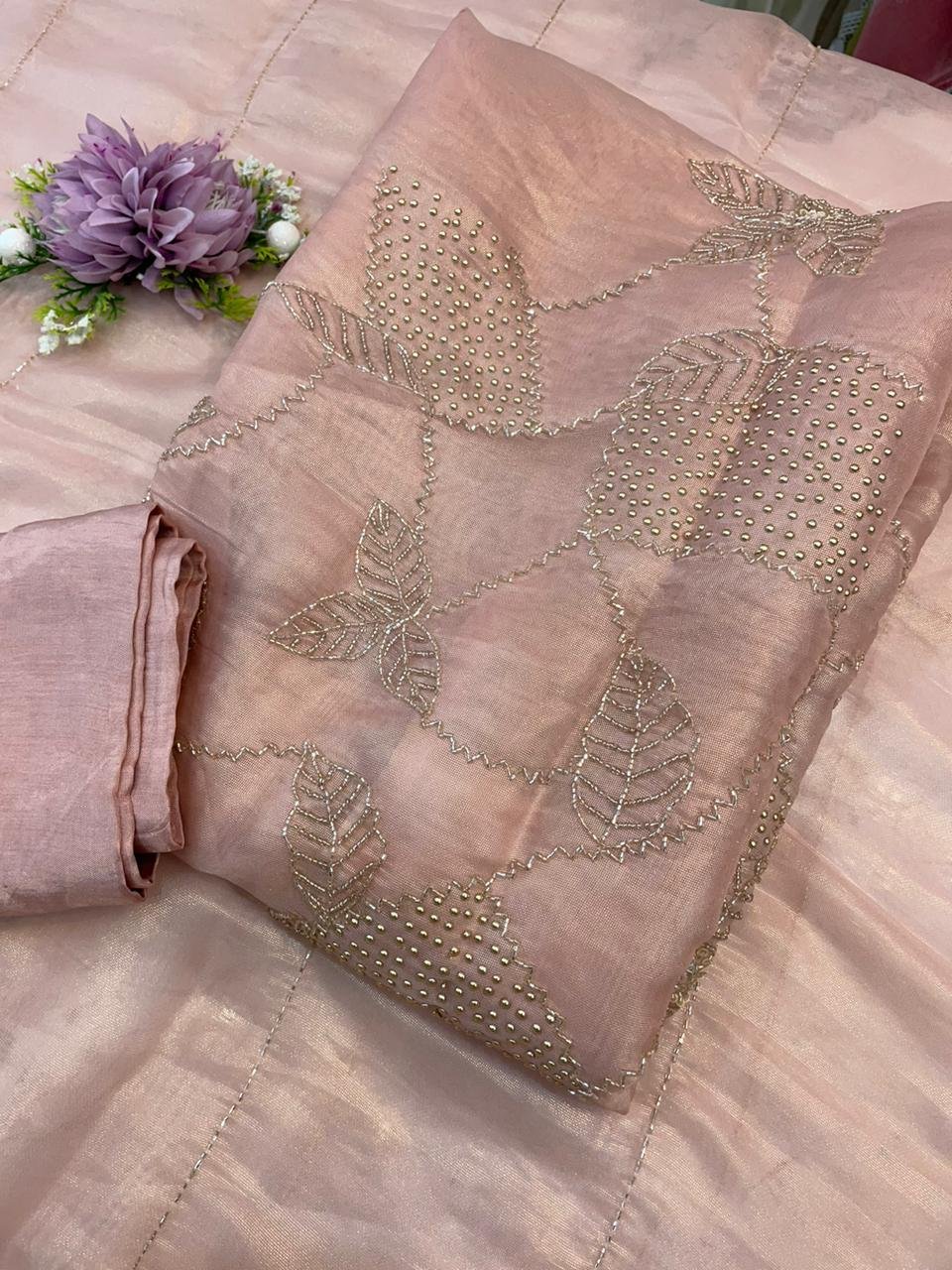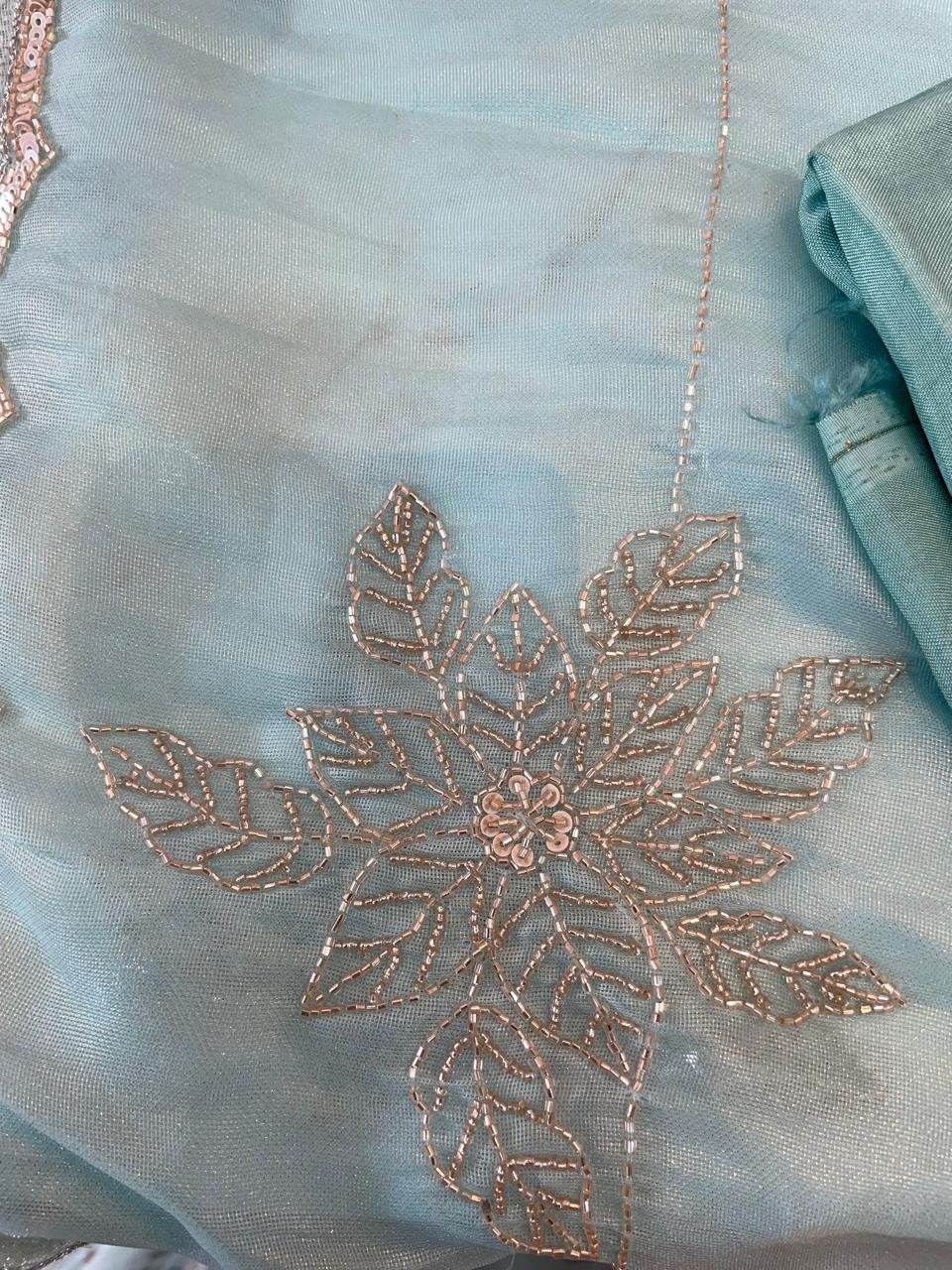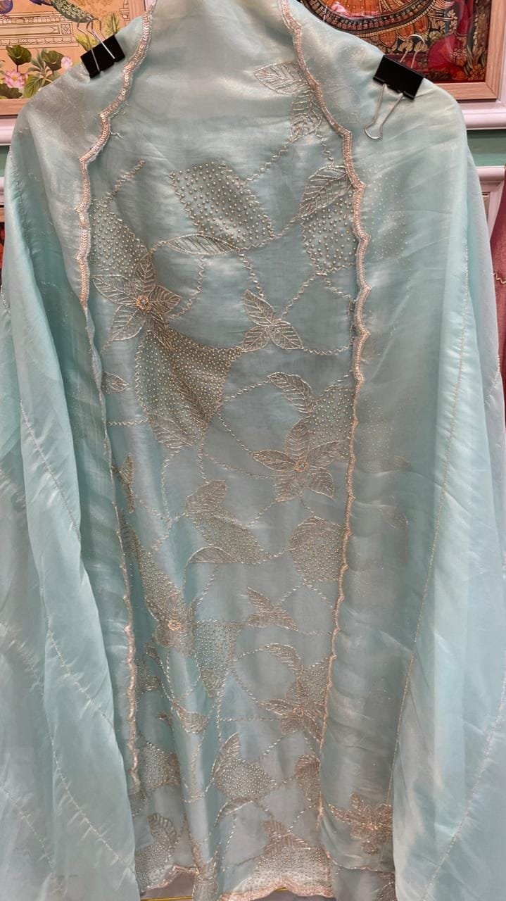 A pastel color rich and elegant organza unstitched suit perfect for any party wear occasion.