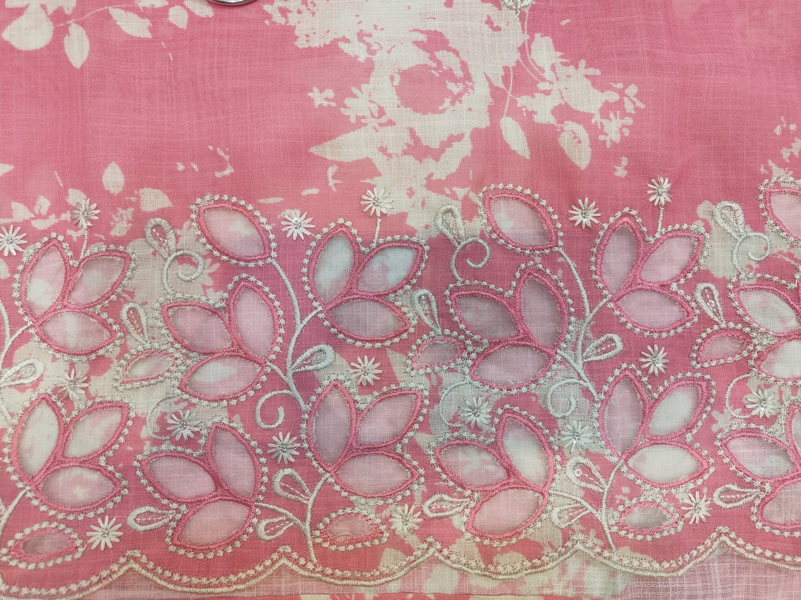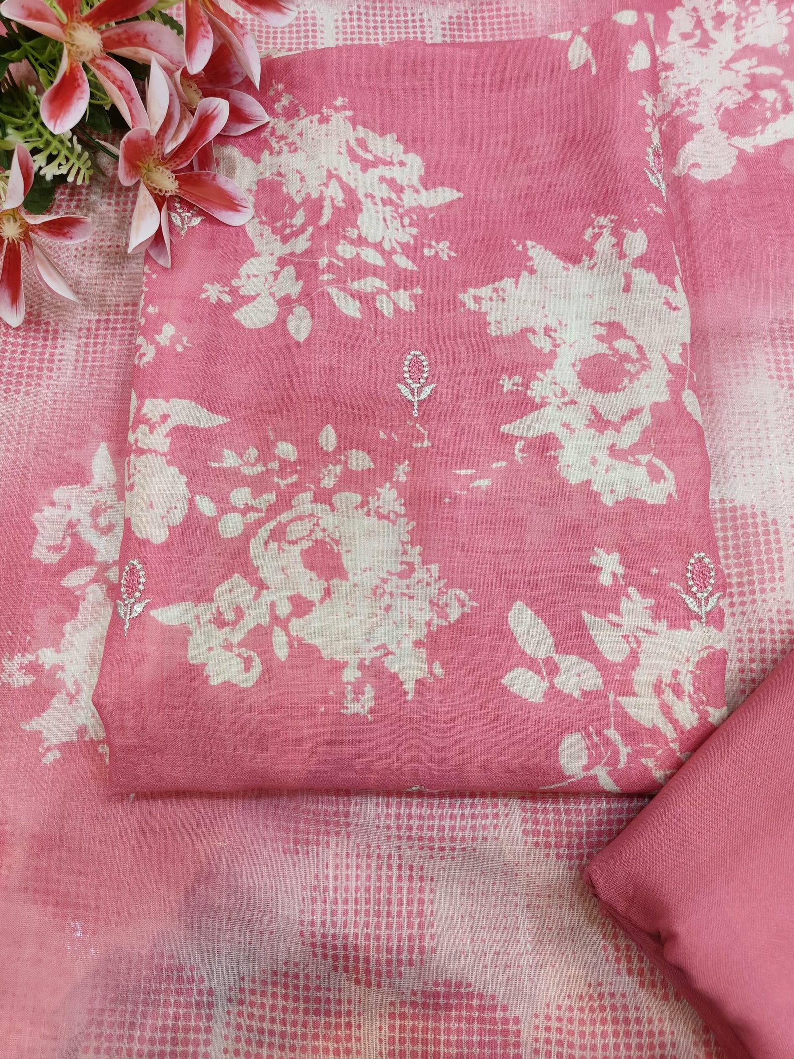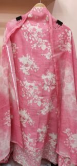 A pure linen cotton unstitched suit in pink hue with floral booti made of thread scattered all over the fabric. The hemline is adorned with cut work and thread work.