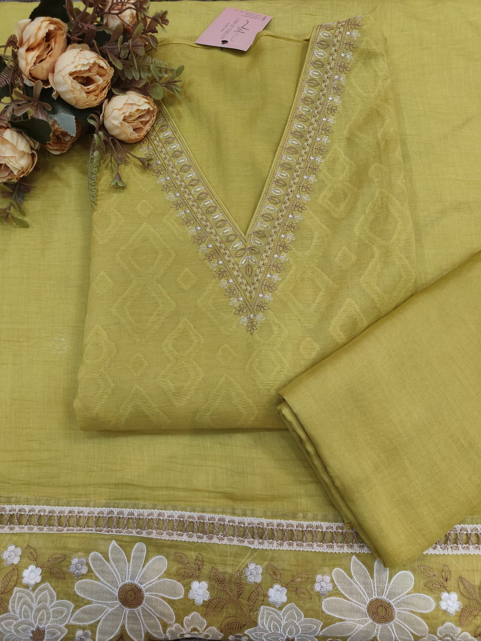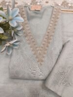 A V neck self design mul chanderi unstitched suit.