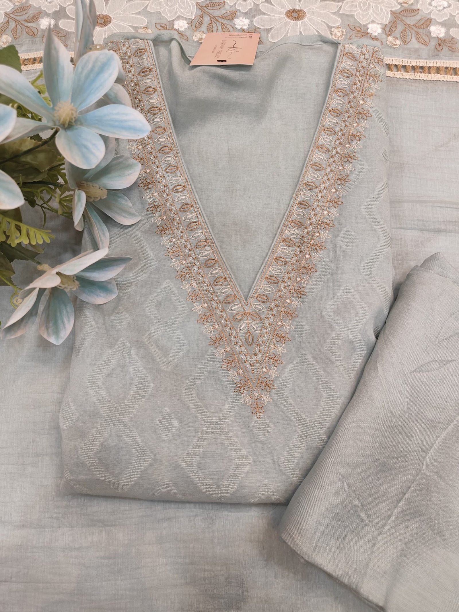 A very light weight summerish unstitched suit with self designing. The neckline is V shaped and is adorned with neat threadwork. The hemline is bordered with creative jute criss-cross lace and floral patchwork and thread work.