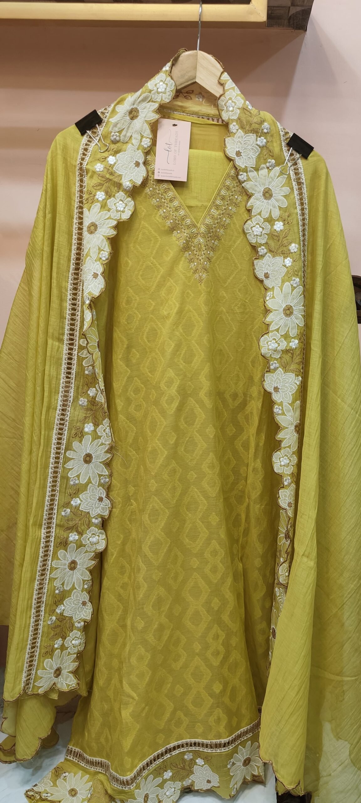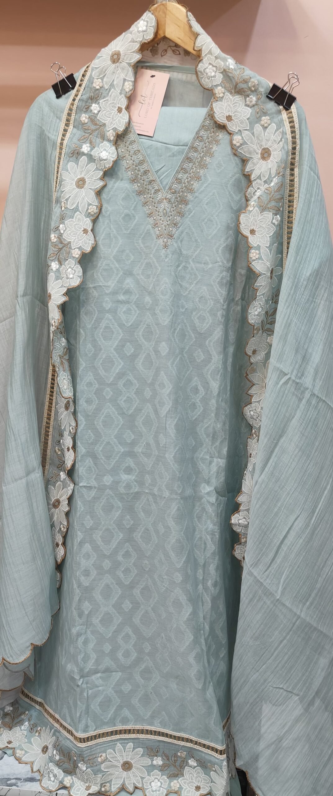 Dupata is adorned with similar floral patch and thread work as in fabric on one side and scalloping on the other end.