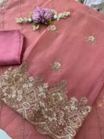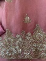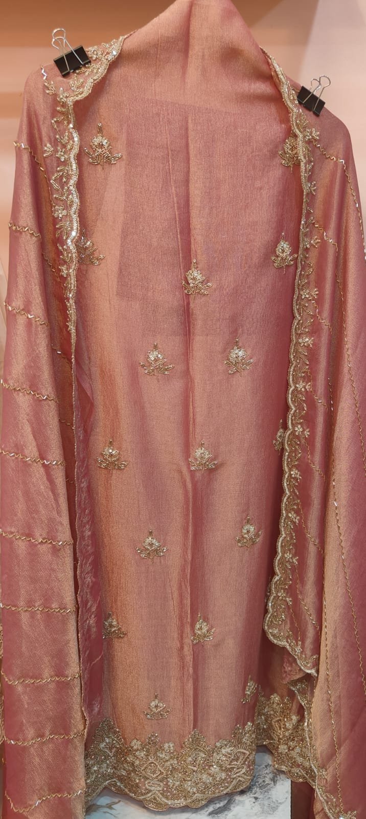 An unstitched suit in onion pink colour featuring intricate embroidery with dapka, beads and sequin embellishments. There is a repetitive and organised placement of floral motifs allover the fabric.