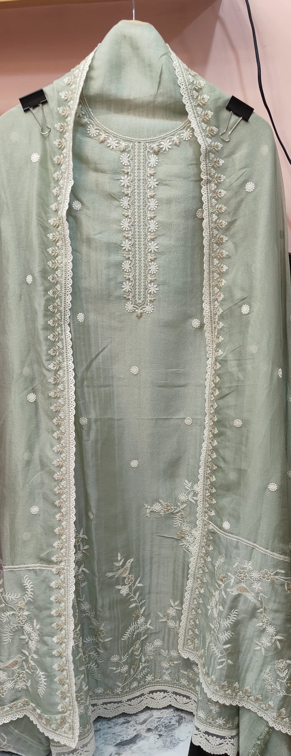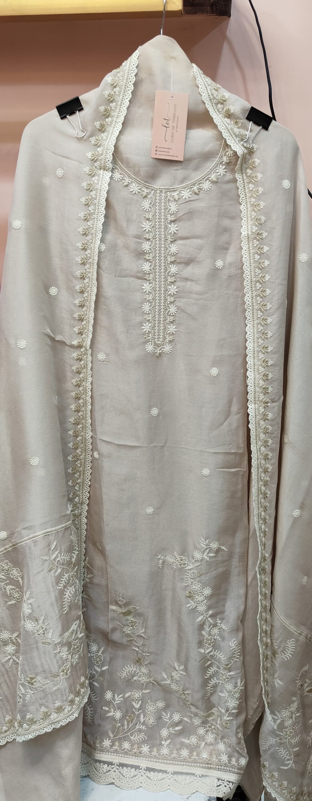 The ensemble has a soft, graceful, and sophisticated appeal, perfect for festive occasions, intimate celebrations, or daytime events. The embroidery work gives a subtle luxury without overwhelming the simplicity of the color.