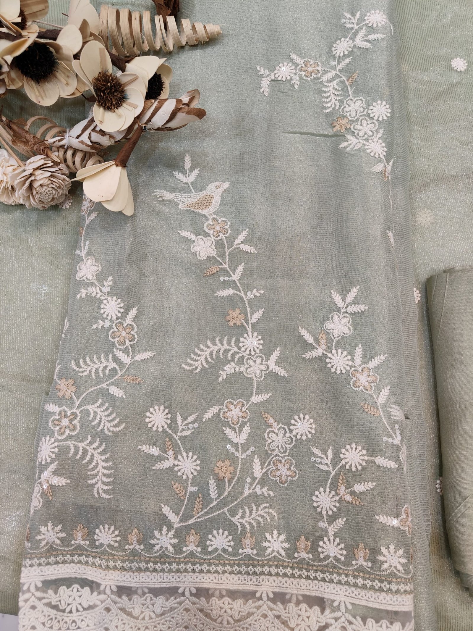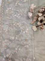 Its a beautiful pastel unstitched suit with a neckline that features delicate floral thread embroidery in white and beige, forming a vertical panel down the front. The fabric has small, evenly spaced white floral motifs embroidered throughout the body.