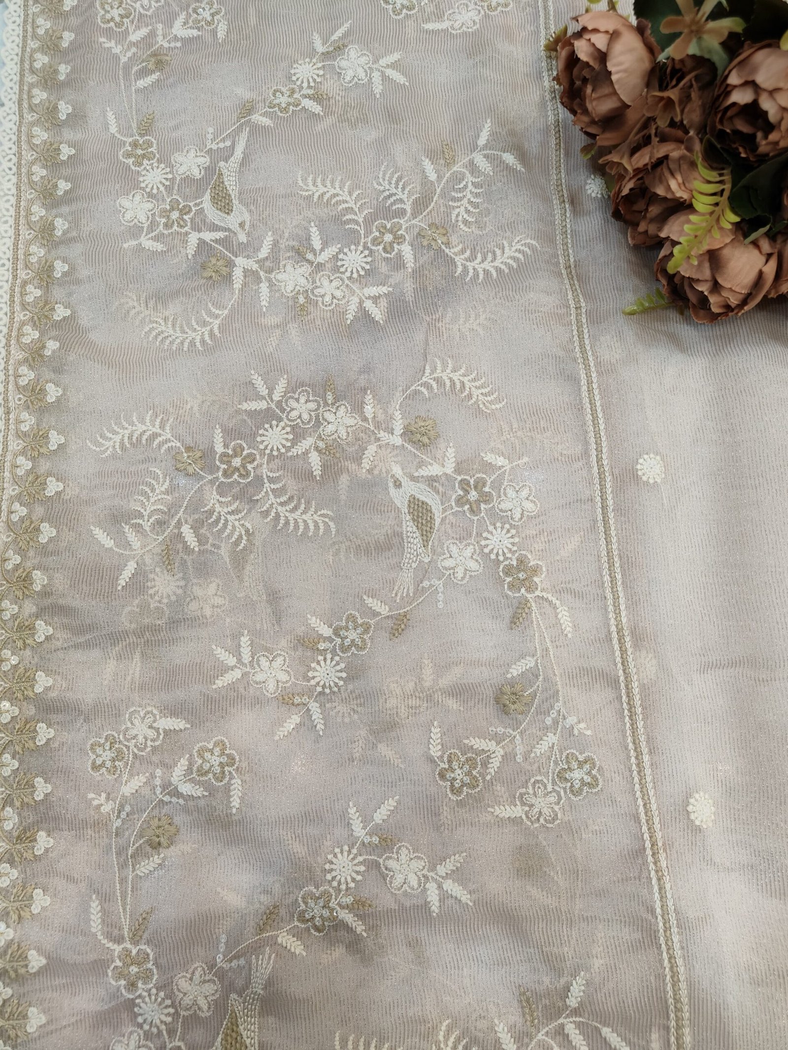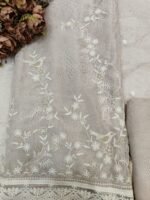 The dupatta is richly embroidered with a matching floral and vine pattern along the borders. It features lace edging and finely embroidered flowers and leaves in white and beige tones. Small floral bootis are scattered across the body, maintaining visual continuity with the kurta.