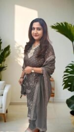 A dark grey stitched bandhej suit that features intricate embroidery with ivory and grey threadwork, light dapka work, moti work and stones arranged in a V shape. There’s a large decorative pendant -like embroidered motif hanging down from the neckline.
