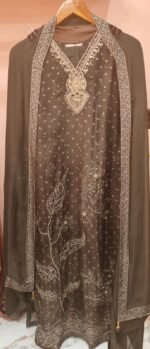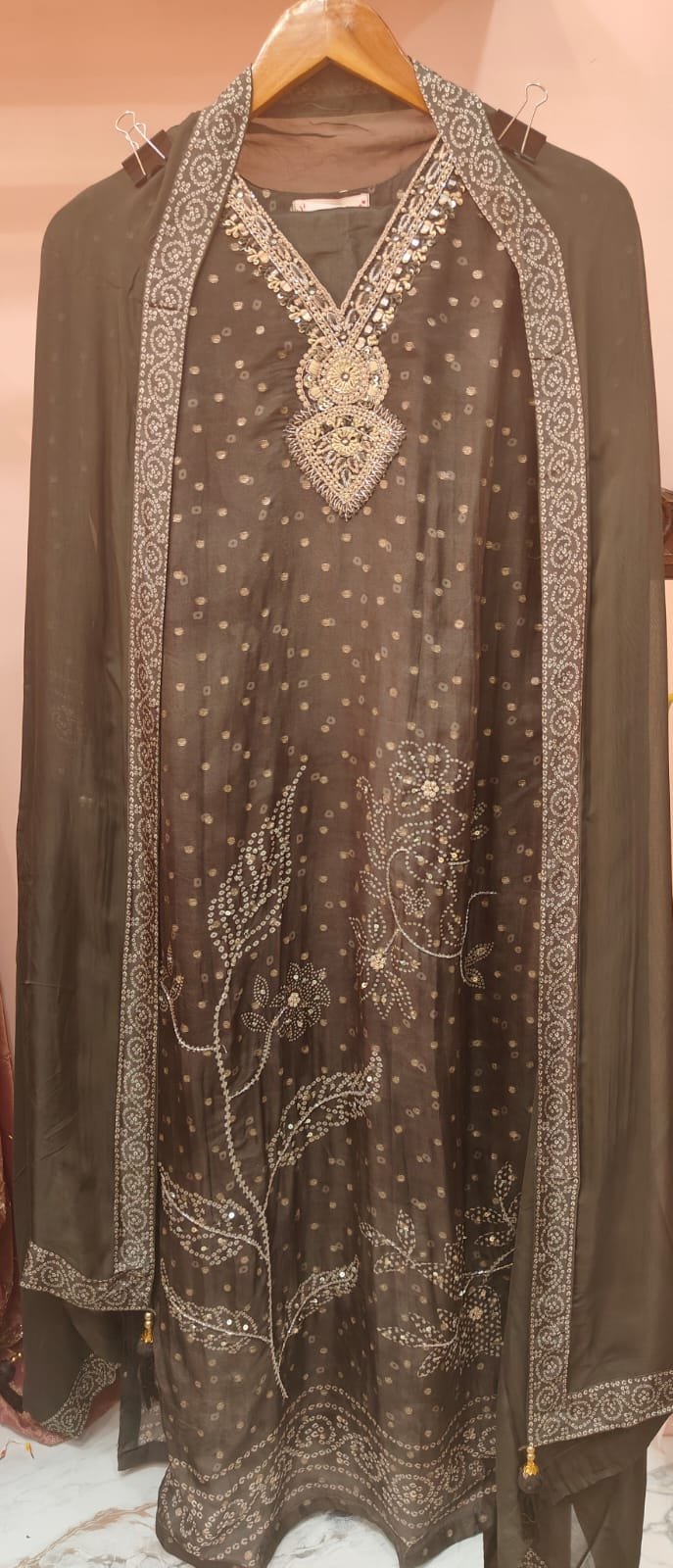 A stitched suit in bhandej with heavy neckline perfect for any semi formal night event.