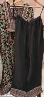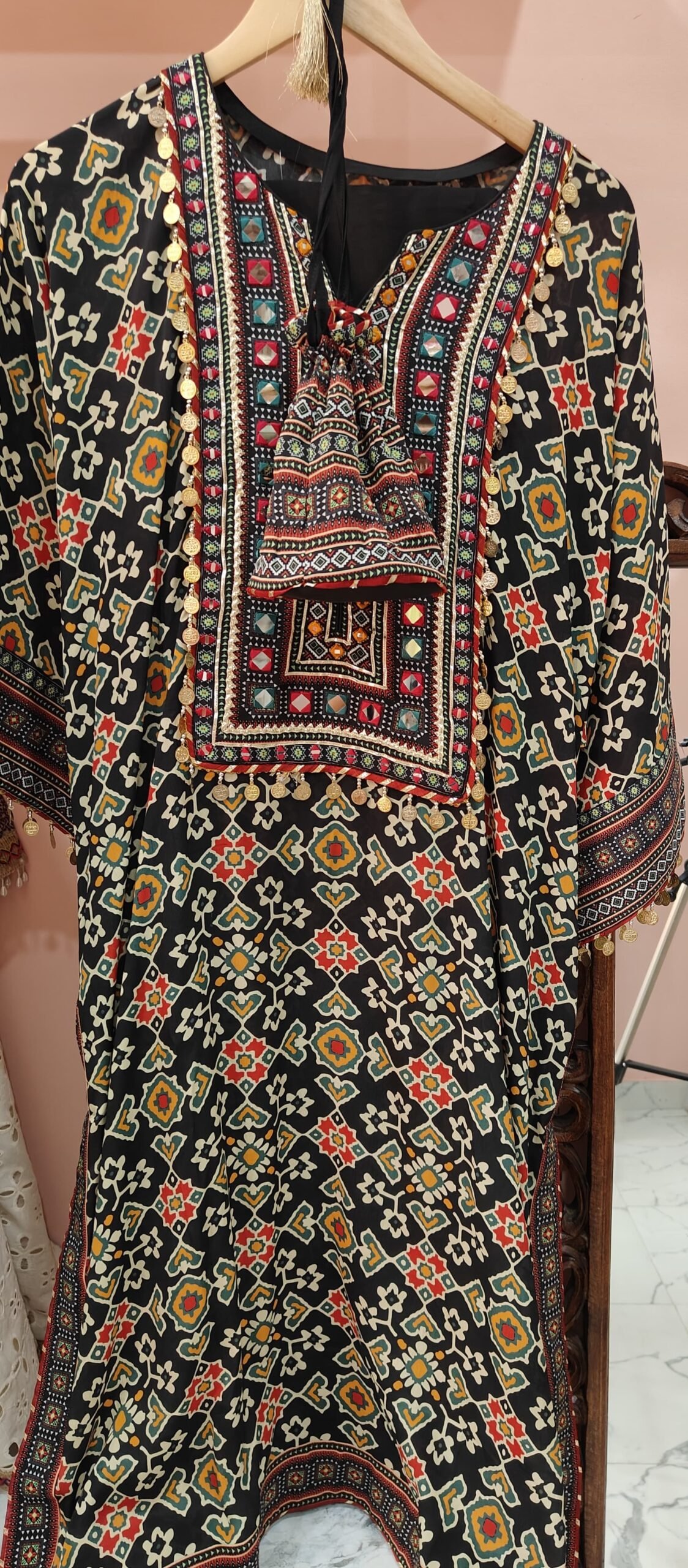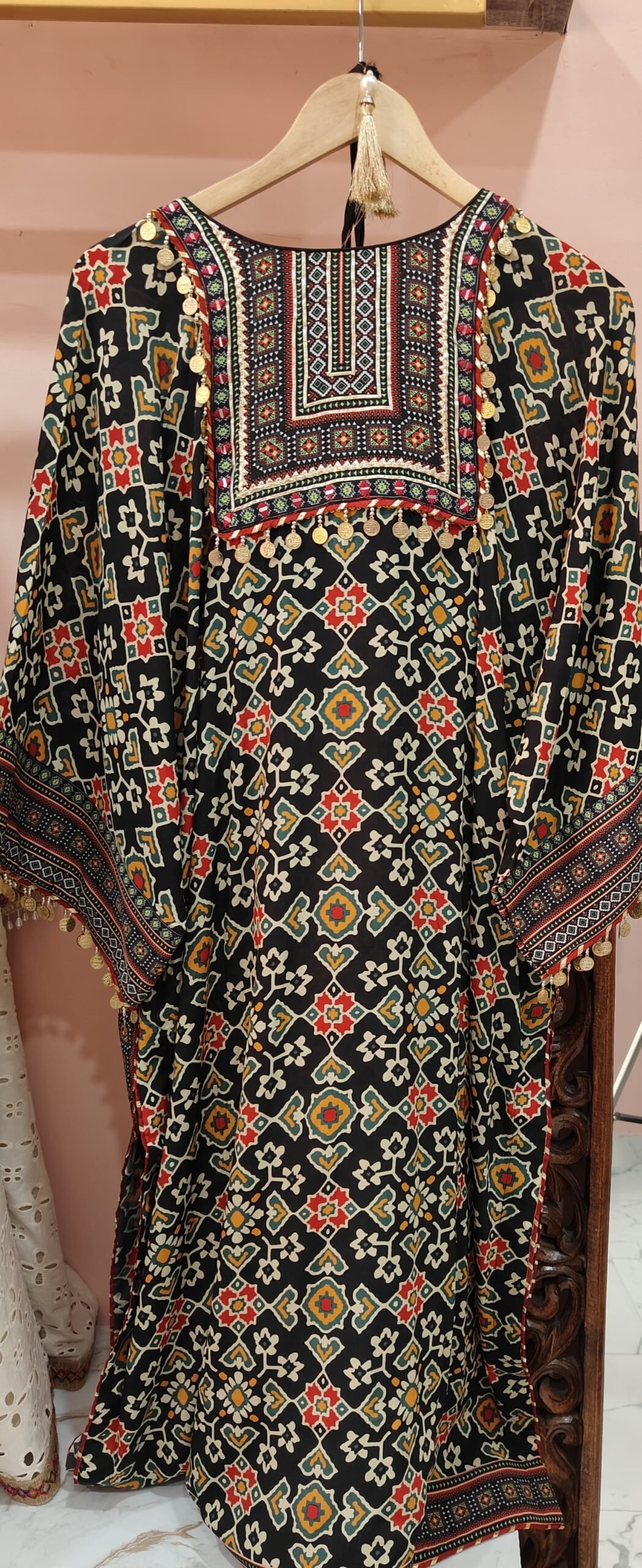 This kaftan is featuring a bold black base with an all-over geometric and floral print in vibrant shades of red, yellow, teal, and white. The neckline is the centerpiece of this outfit, heavily embroidered in intricate geometric patterns with mirror work, colorful thread embroidery, and vibrant bead detailing. The neckline is further accented with a decorative tassel tie-up.