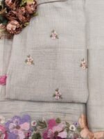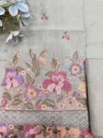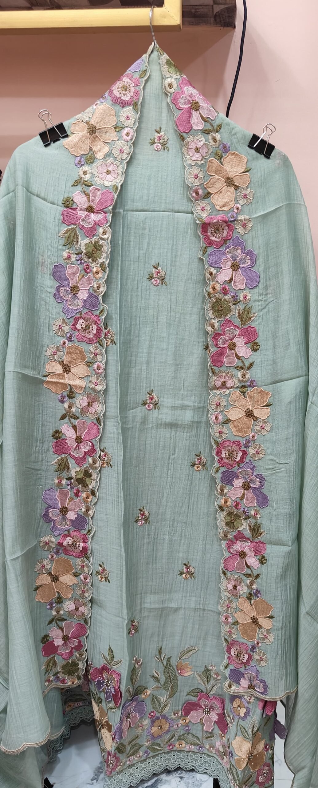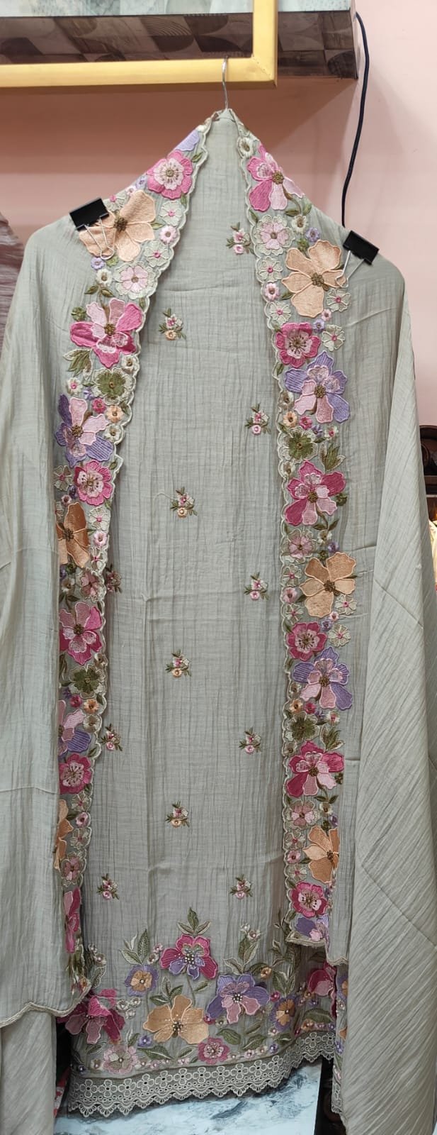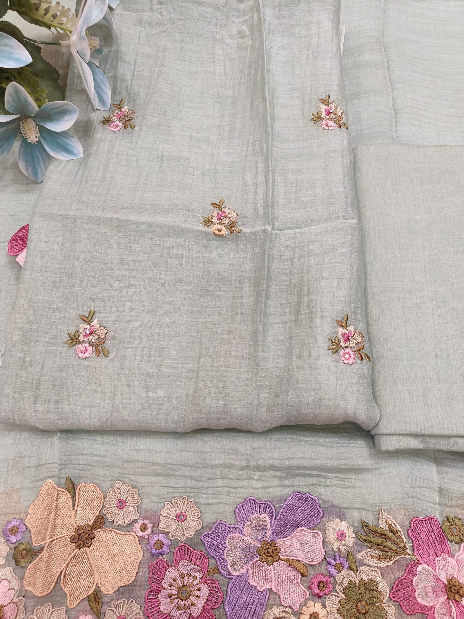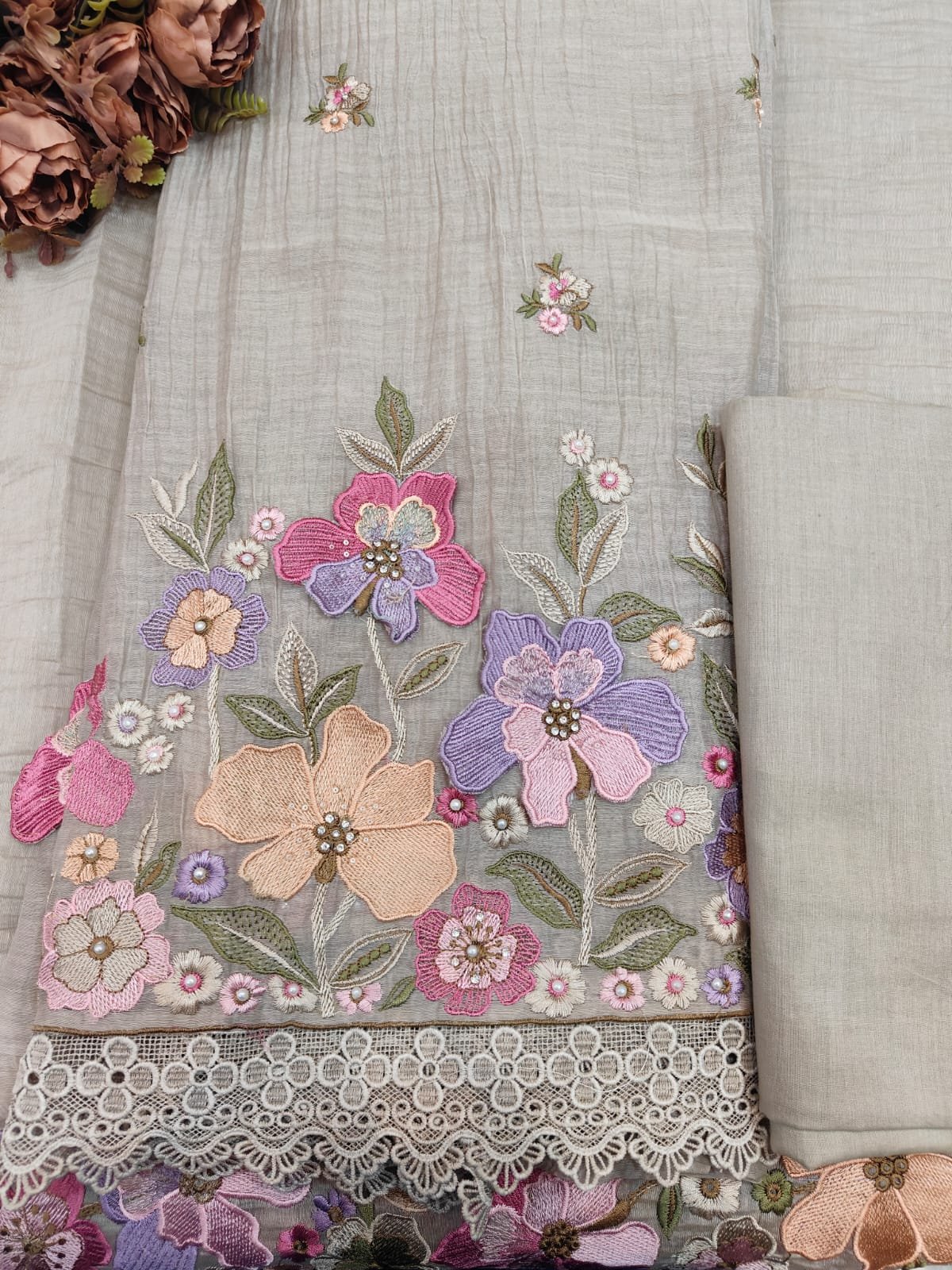 A mul chanderi unstitched suit in pastel hues that is richly adorned with small floral motifs that are scattered across the fabric. The highlight of the suit is the hemline that is embellished with multicolored 3D floral embroidery. The flowers are finely detailed with threadwork and hints of bead work at the center, adding dimension and texture. The bottom edge is finished with a lace trim, enhnacing the overall delicate look.