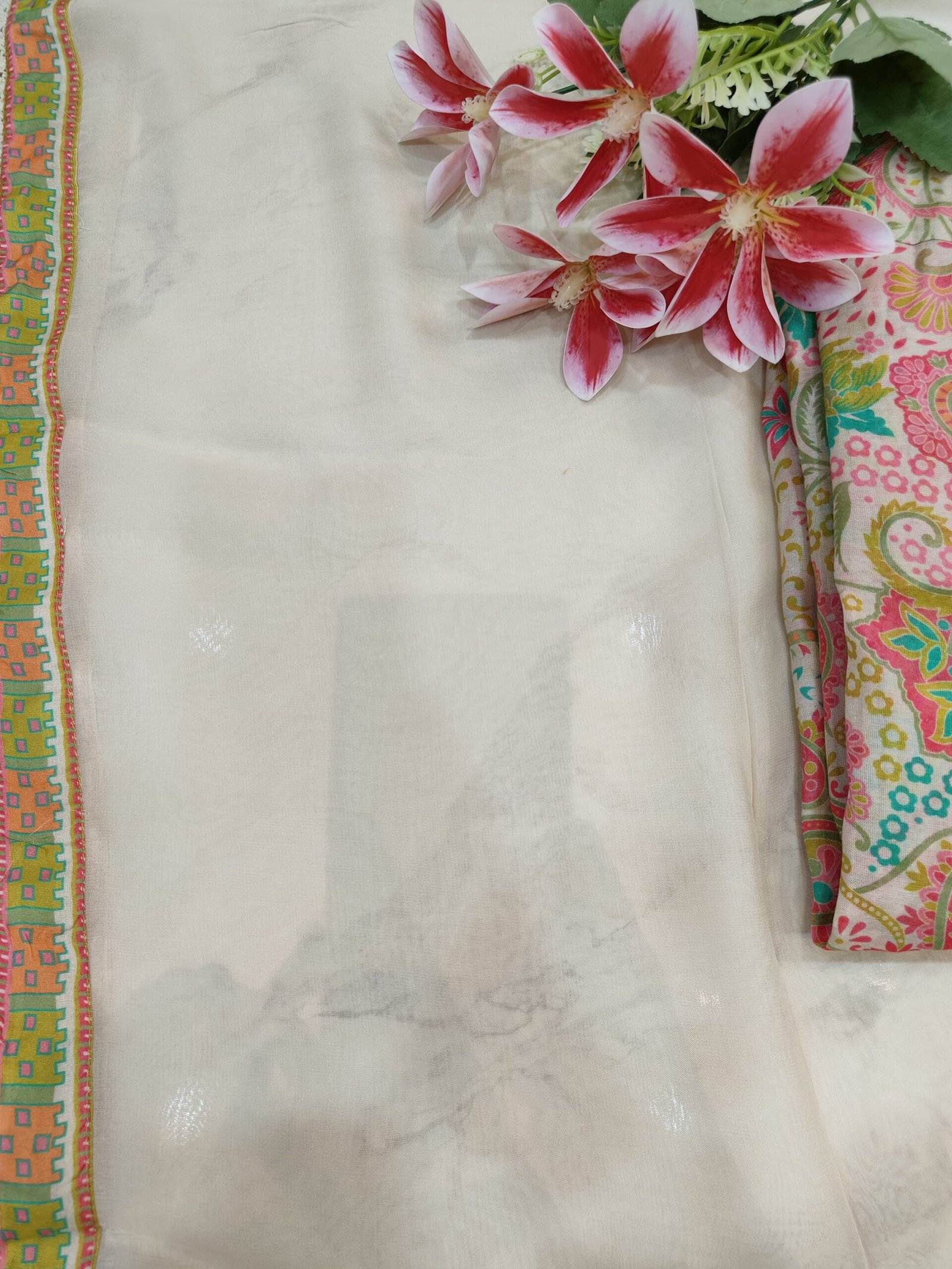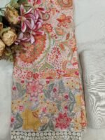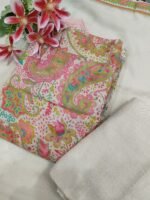 An unstitched mul chanderi digital printed suit perfect for any semi formal occasion.
