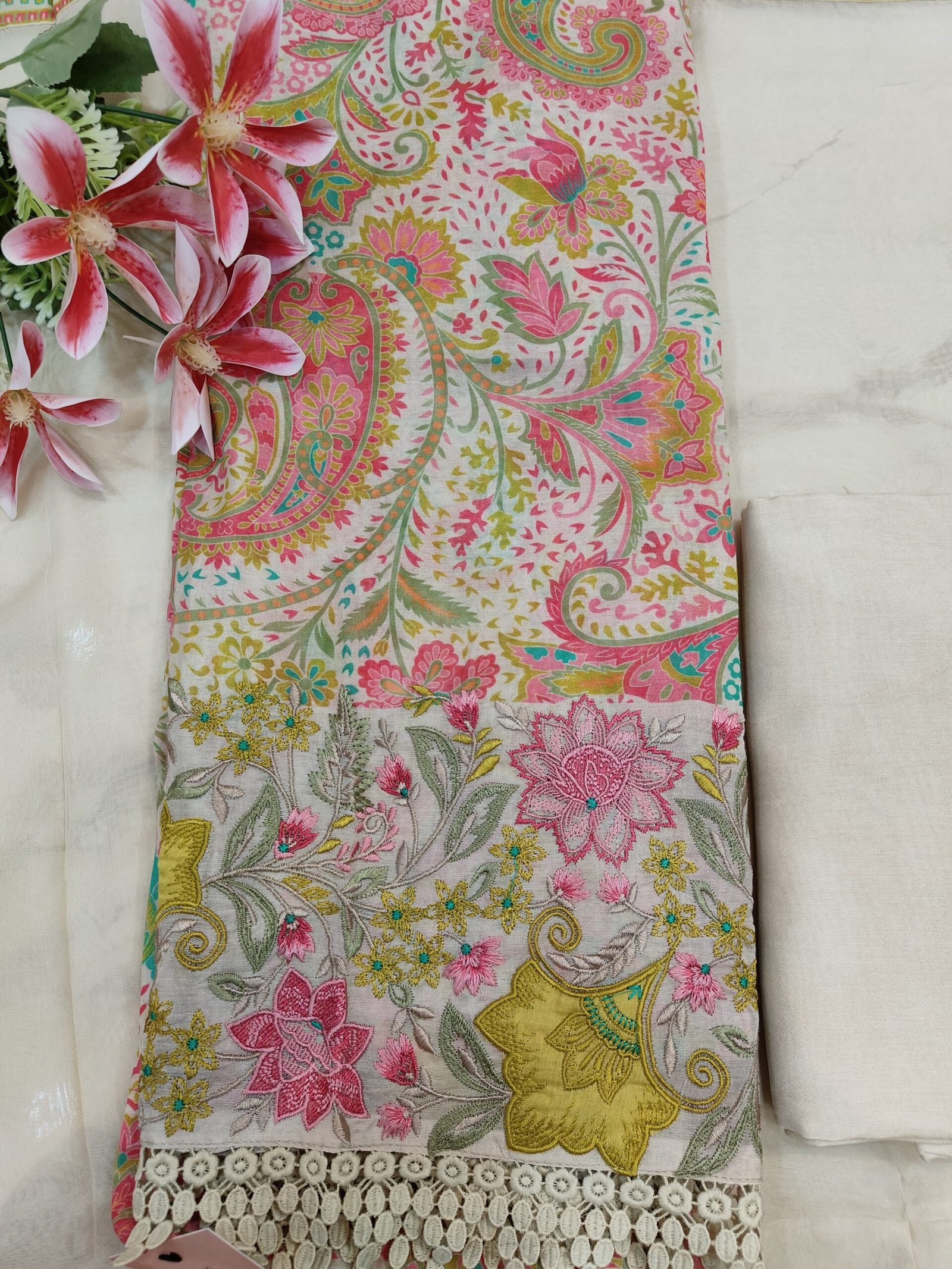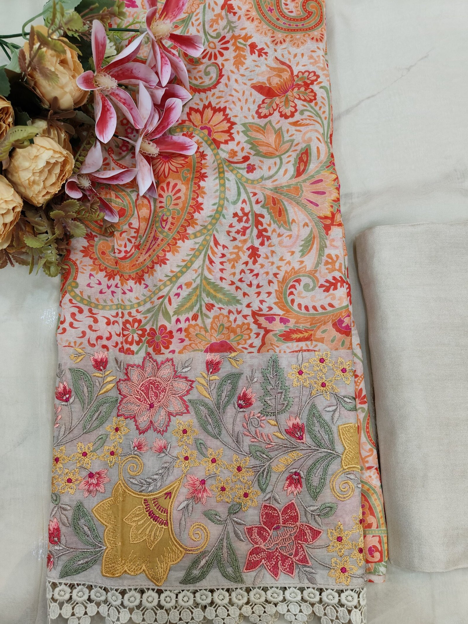 A mul chanderi unstitched suit in a digital print. The hemline is adorned with floral threadwork to elevate the aesthetic look.