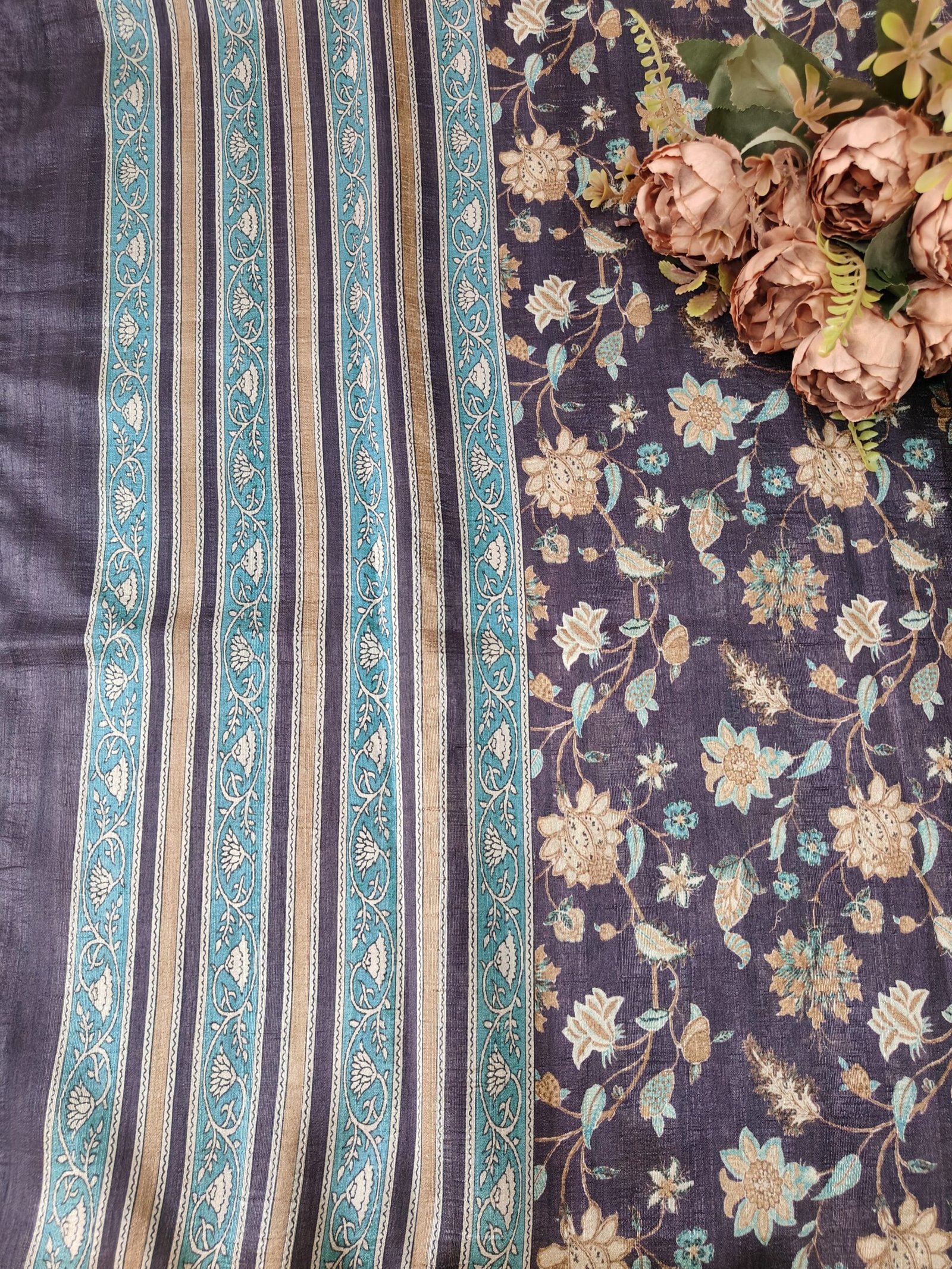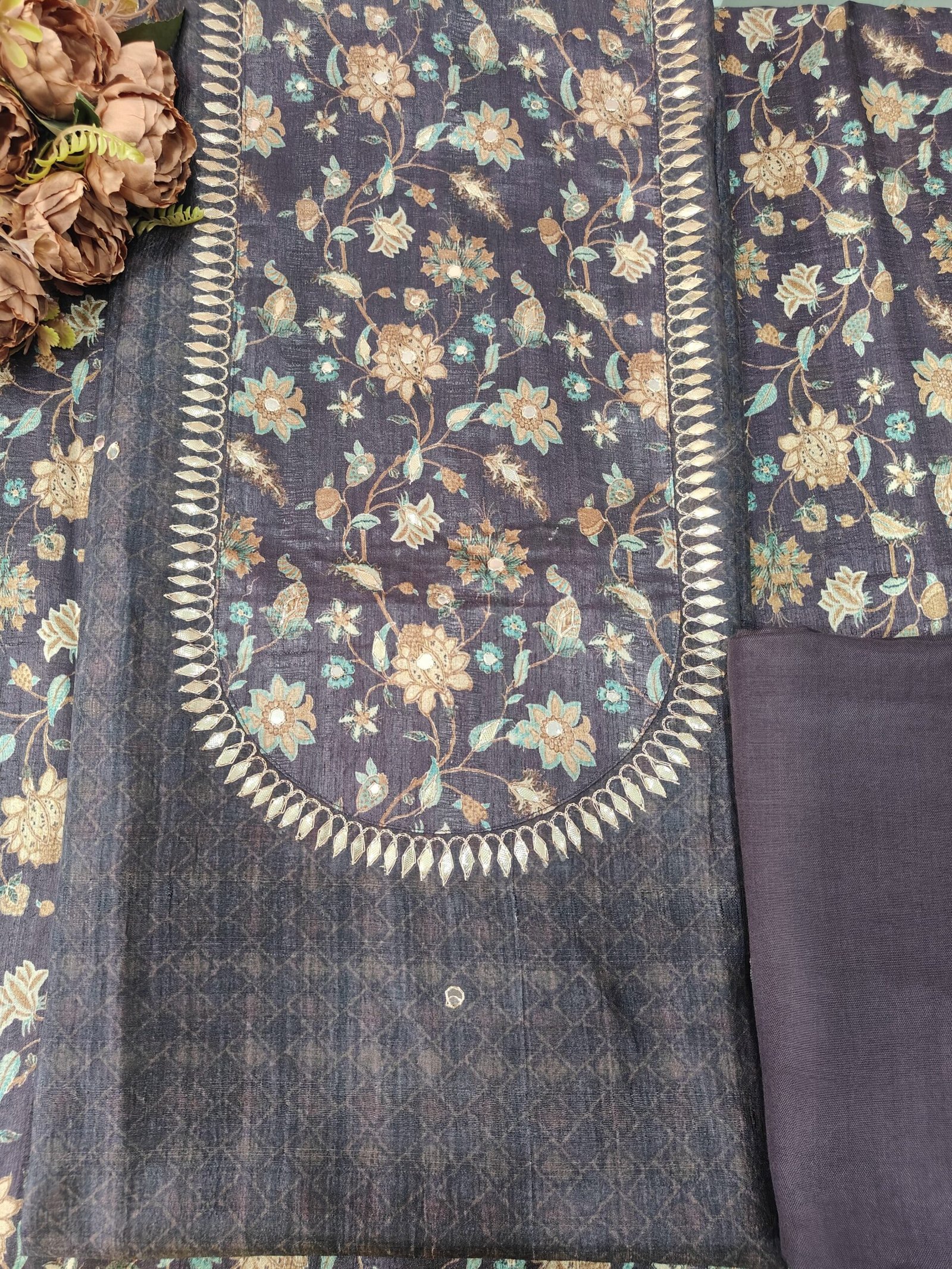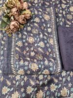 This unstitched suit in purple color has a striking yoke in digital print highlighted with small mirror work. The yoke is framed with a gold lace border made of gotta pati adding richness. The hemline is bordered with a fine golden lace completing the whole look.