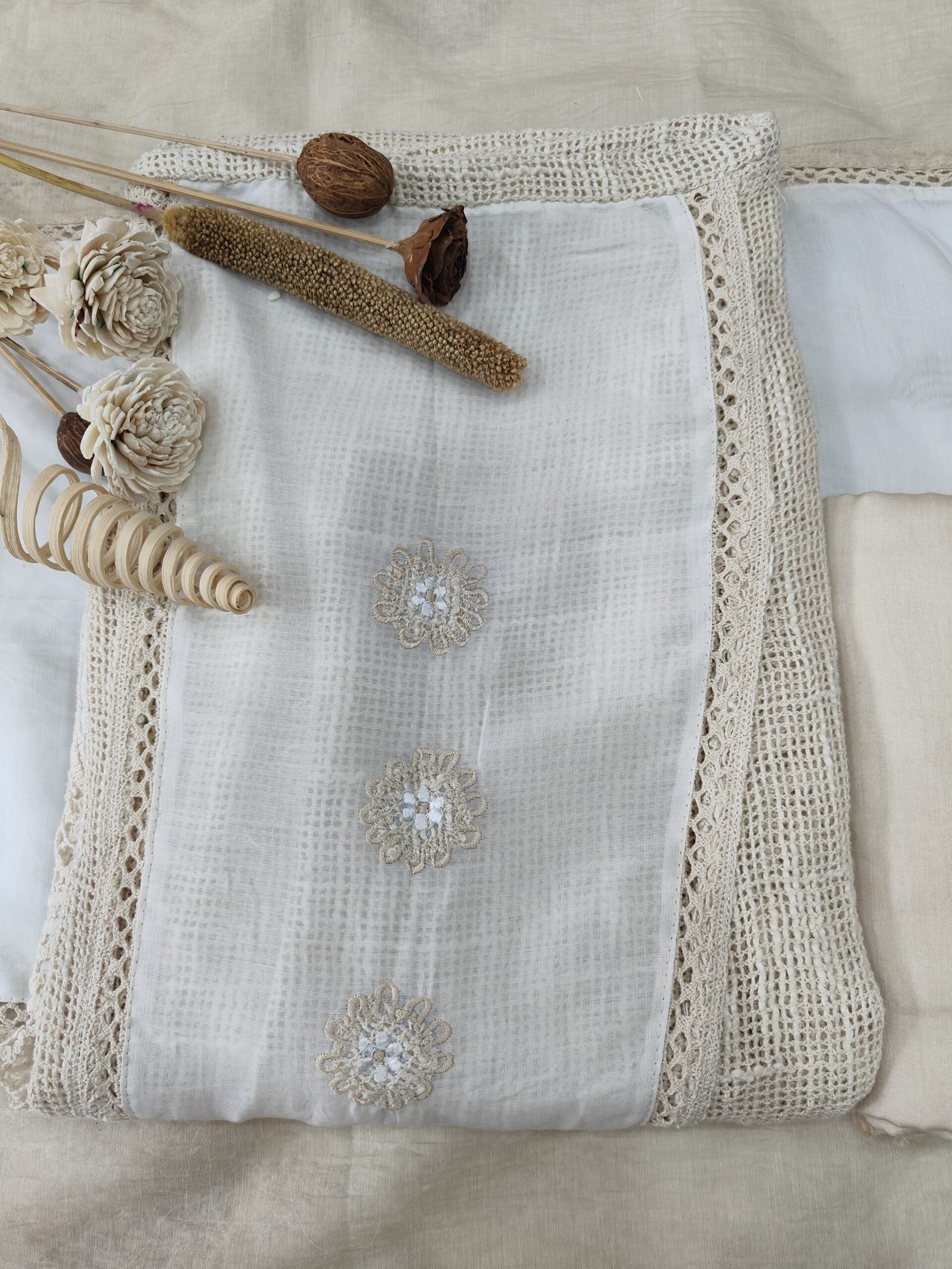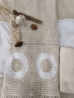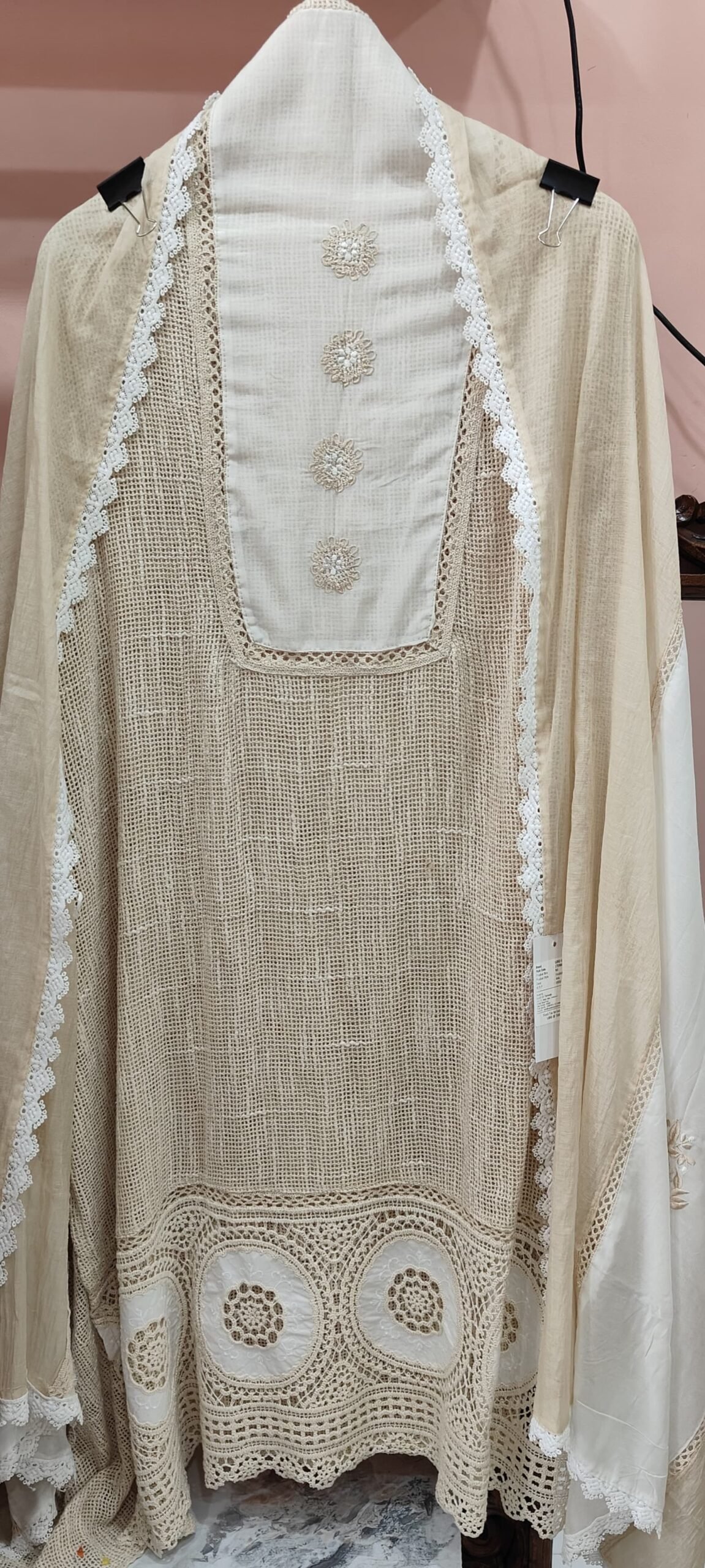 At the hem, there’s a broad border of intricate crochet work with circular off-white patches embroidered with floral motifs, enhancing the artisanal appeal.