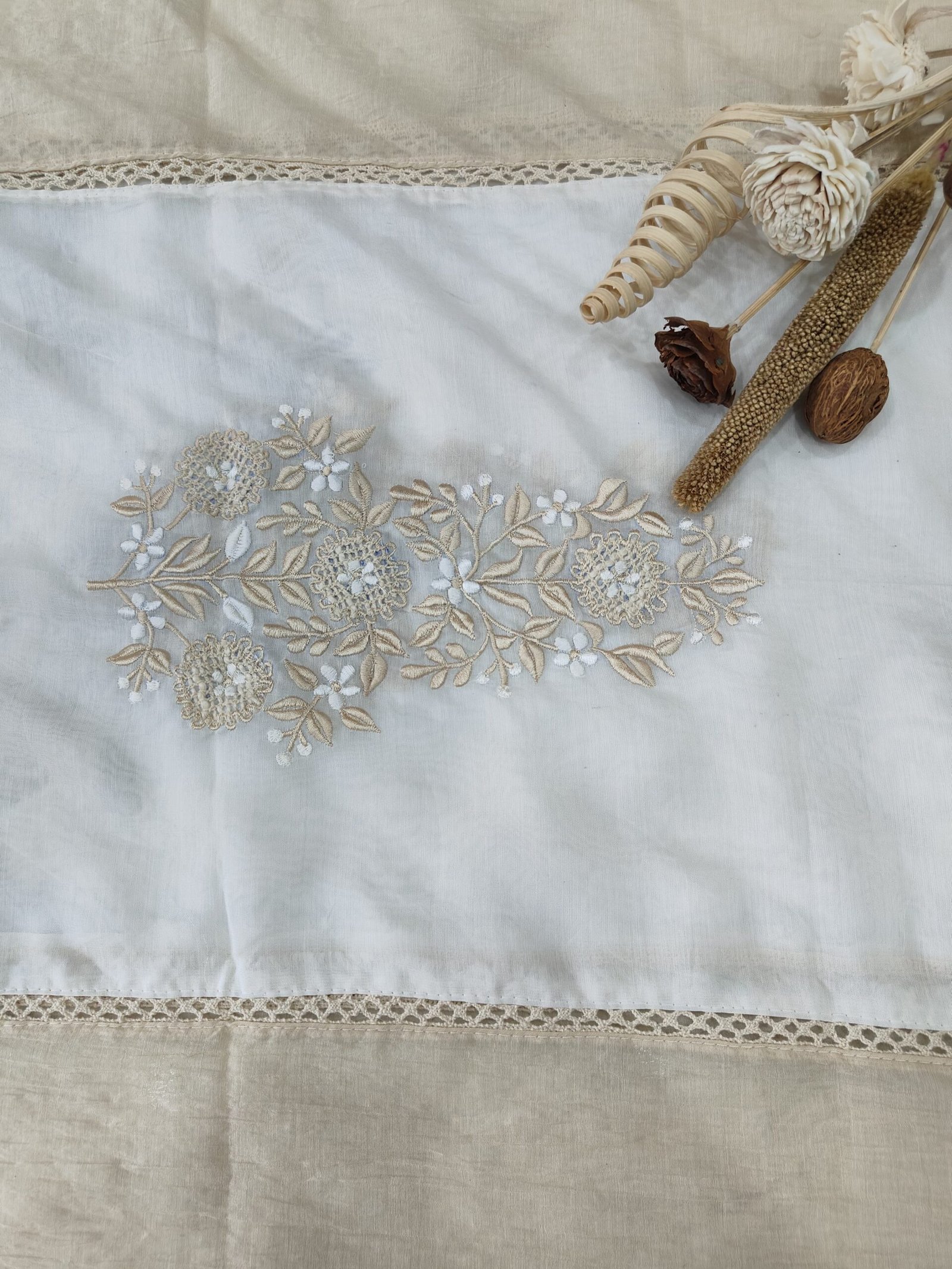 Full length designer dupatta in ivory and beige color with large motif made of thread embroidery bordered with delicate scalloped white lace.