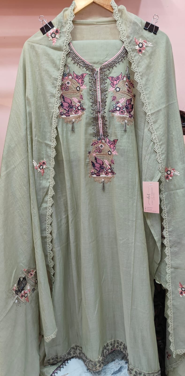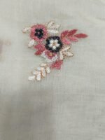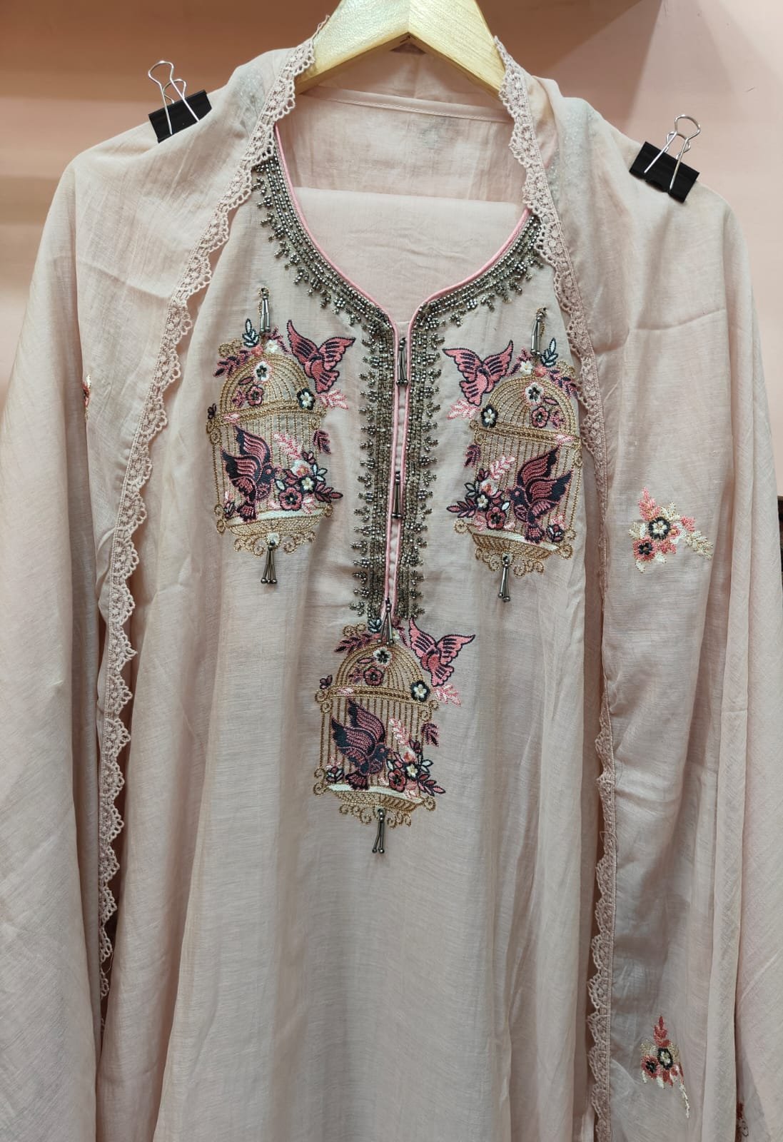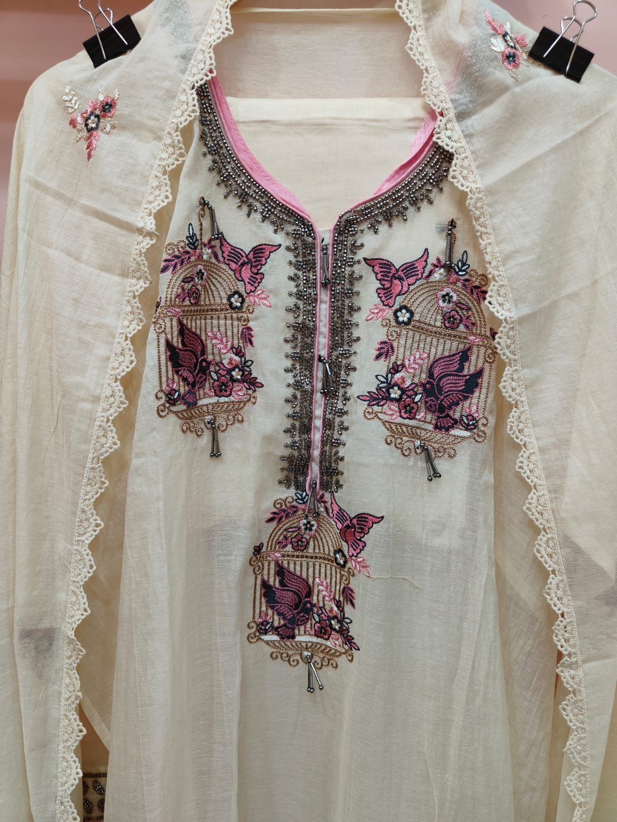 A mul chanderi unstitched suit where front panel is adorned with beautiful threadwork embroidery featuring bird cage. Heavy neckline with metallic beadwork.