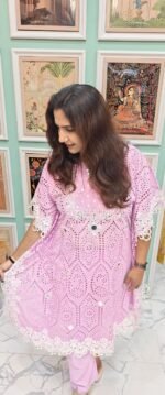 The kurta has elbow-length sleeves with the same cutwork and lace edges, maintaining continuity in the design.