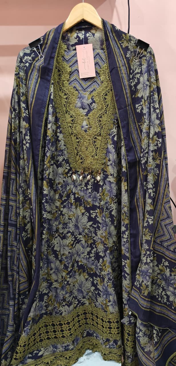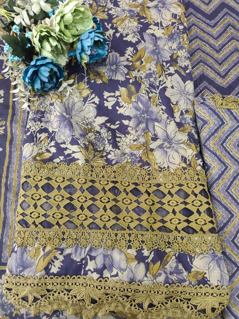 The fabric is pure cotton printed with floral motifs and bordered with geometric striped patterns for contrast. The bottom hem of the kurta is finished with wide olive lace detailing, adding richness and balance to the look.