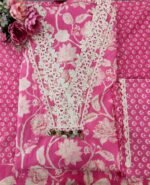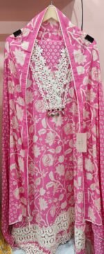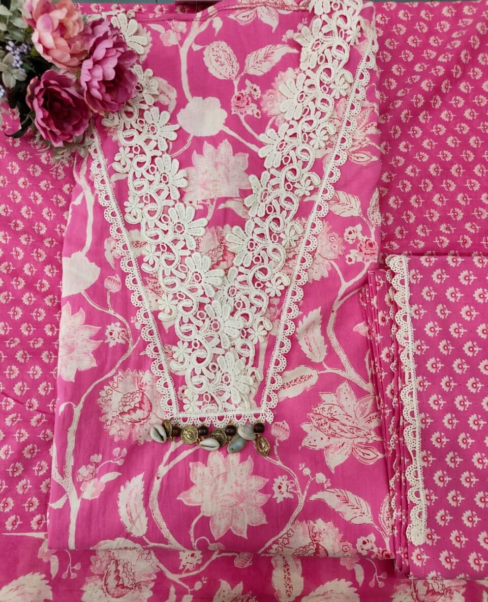 The suit is crafted in a vibrant pink base adorned with cream-white floral prints all over, giving it a refreshing and festive vibe. The neckline is embellished with heavy cream crochet-style lace embroidery in floral patterns, finished with tiny dangling beads for an ornamental touch.