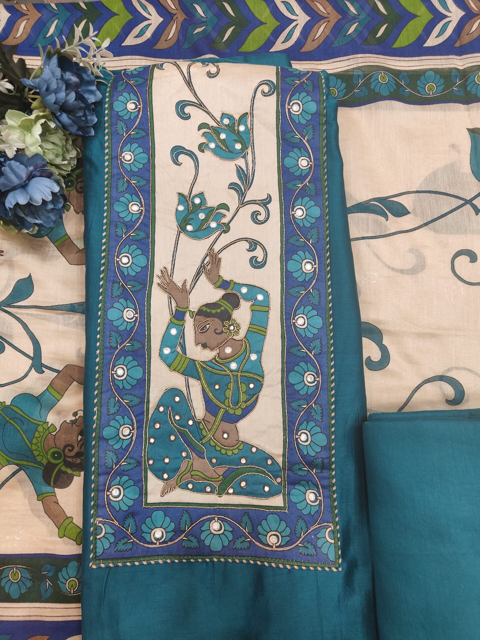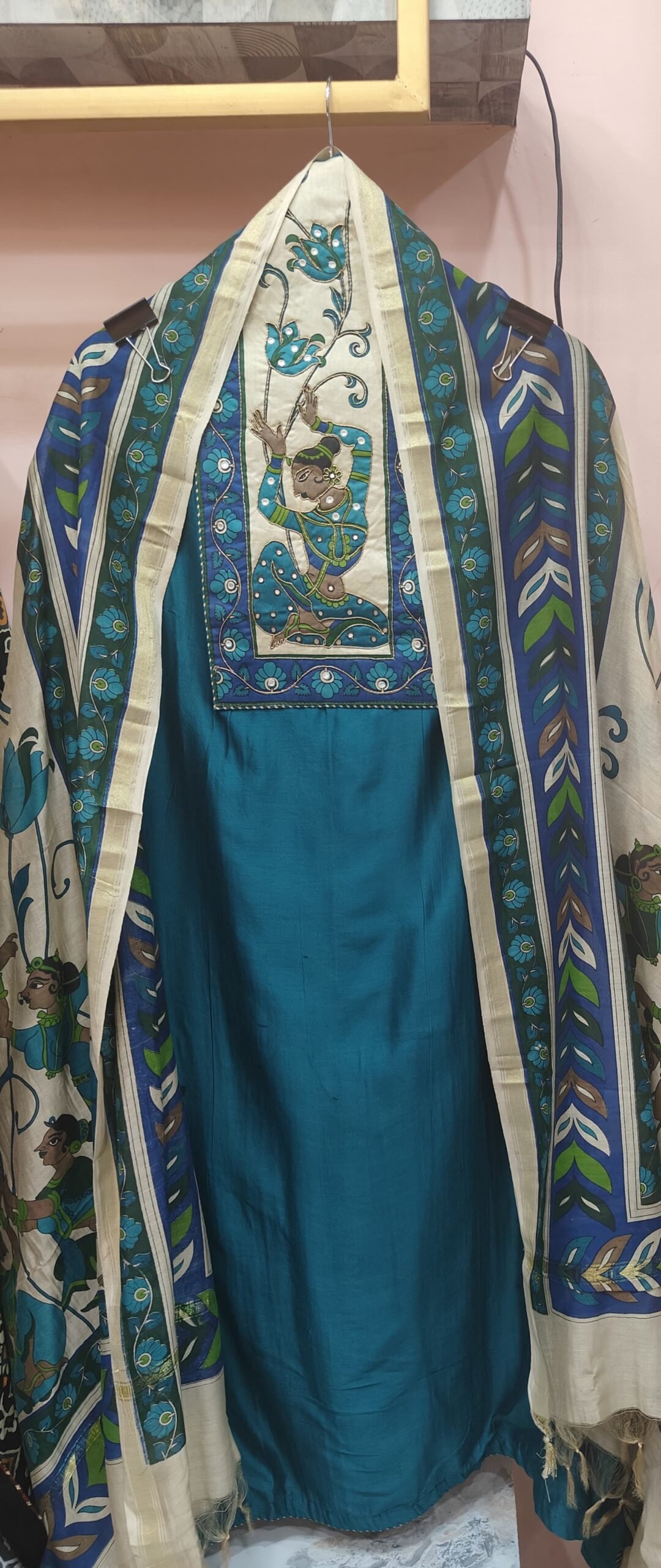 This suit is a vibrant and artistic ethnic ensemble, celebrating traditional Indian craftsmanship and folk art aesthetics. The yoke panel is the standout feature – it showcases a hand-painted or printed tribal/folk-style dancing woman motif in earthy tones of blue, cream, and green, bordered by floral patterns. This gives the kurta a strong artisanal and cultural vibe.