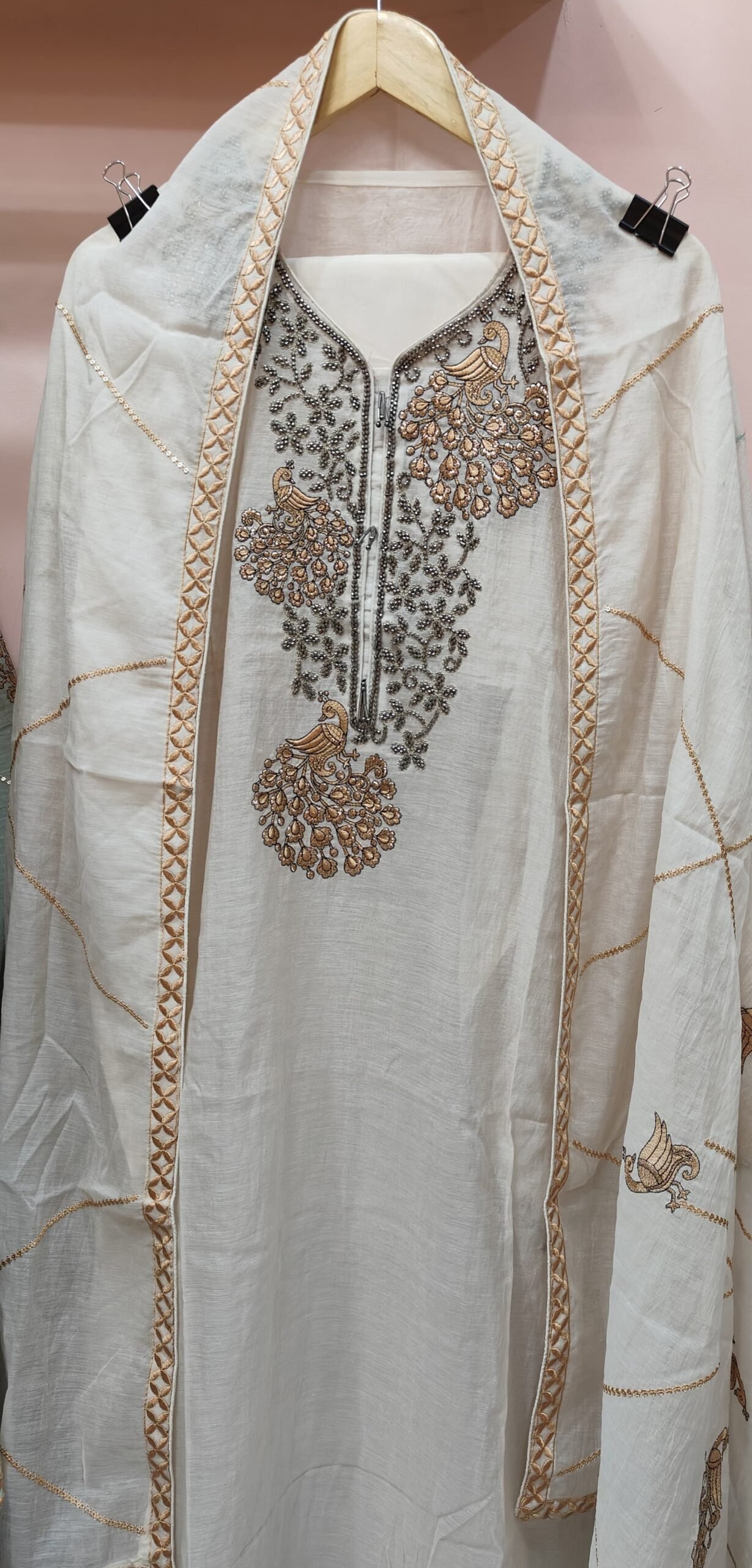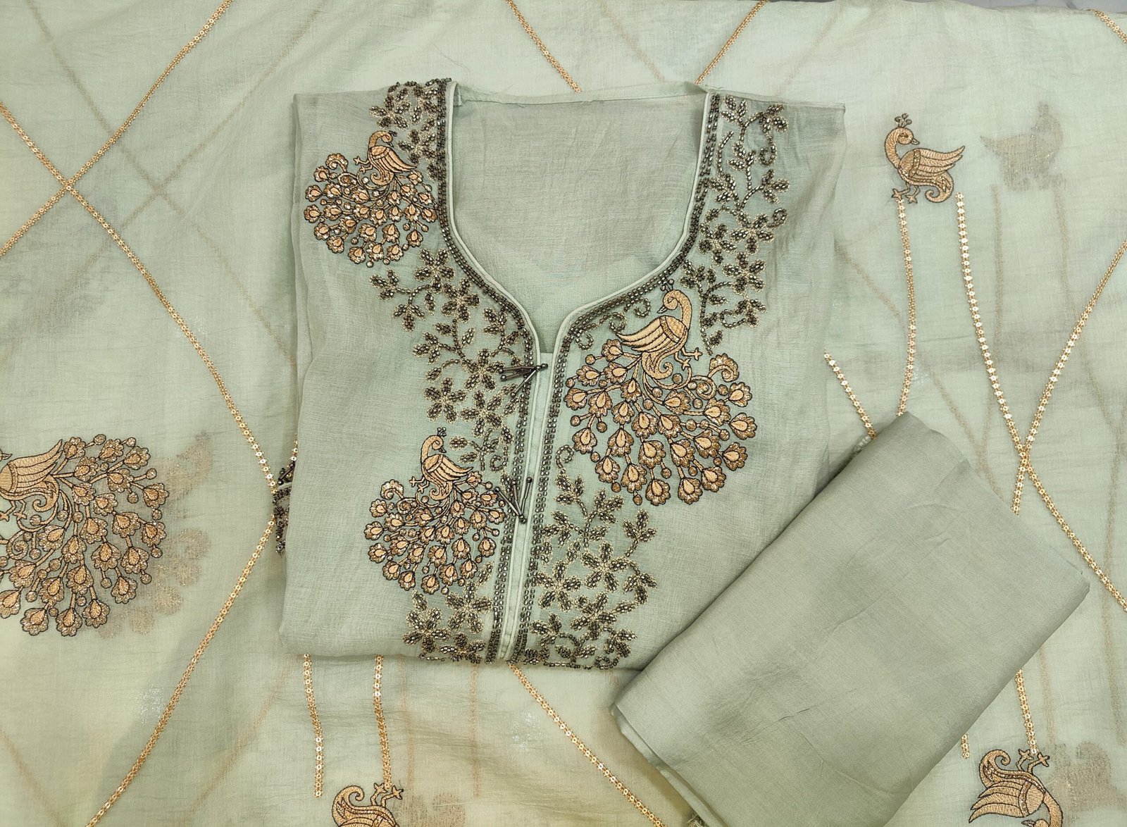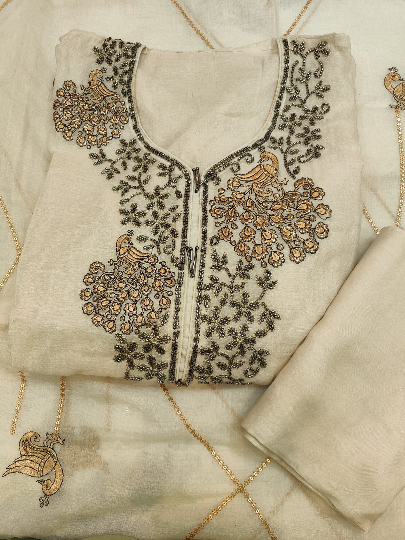 An unstitched suit in which the neckline is adorned with elaborate embroidery in silver and golden tones, featuring delicate floral patterns and bird motifs that add a touch of artistry and elegance. The embroidery includes beaded work that enhances the richness and texture of the design.
