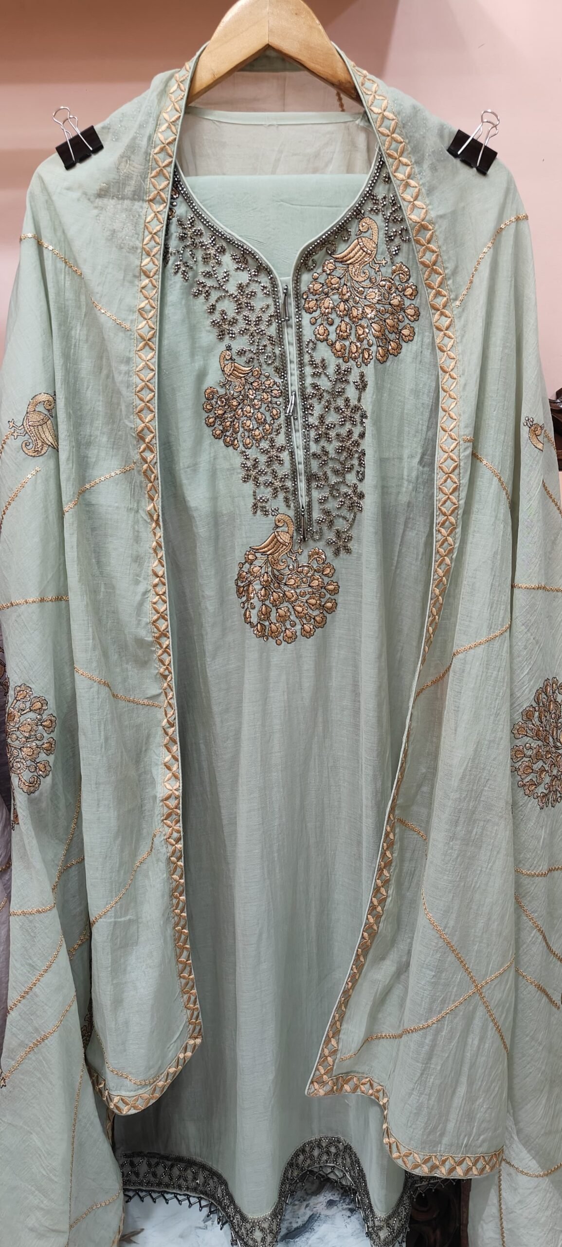 The dupatta is bordered with a beautifully woven geometric pattern in a peachy-gold thread, which complements the kurta perfectly. It features fine, subtle embroidery lines that run diagonally across, adding depth and visual interest. Small embroidered bird motifs are scattered across the dupatta, echoing the theme on the kurta and creating a cohesive design.